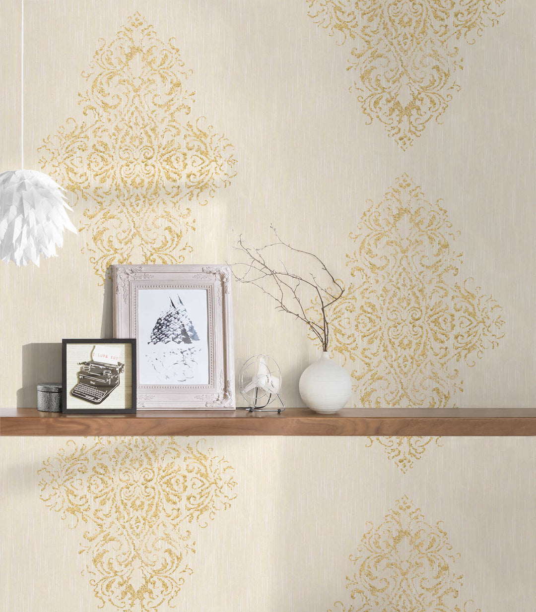 Tekstilės tapetai su aukso ornamentu smėlio spalvos fone, 1157734