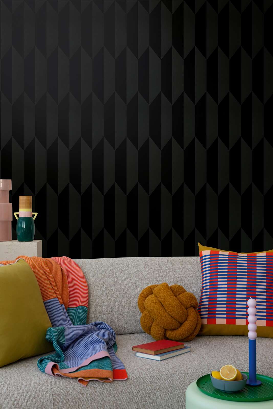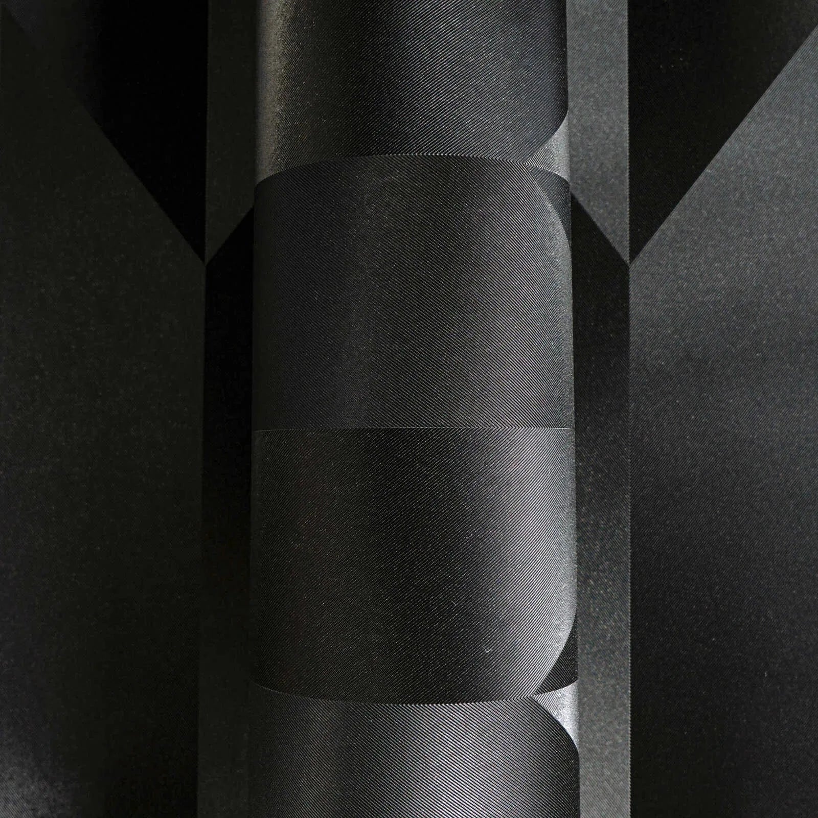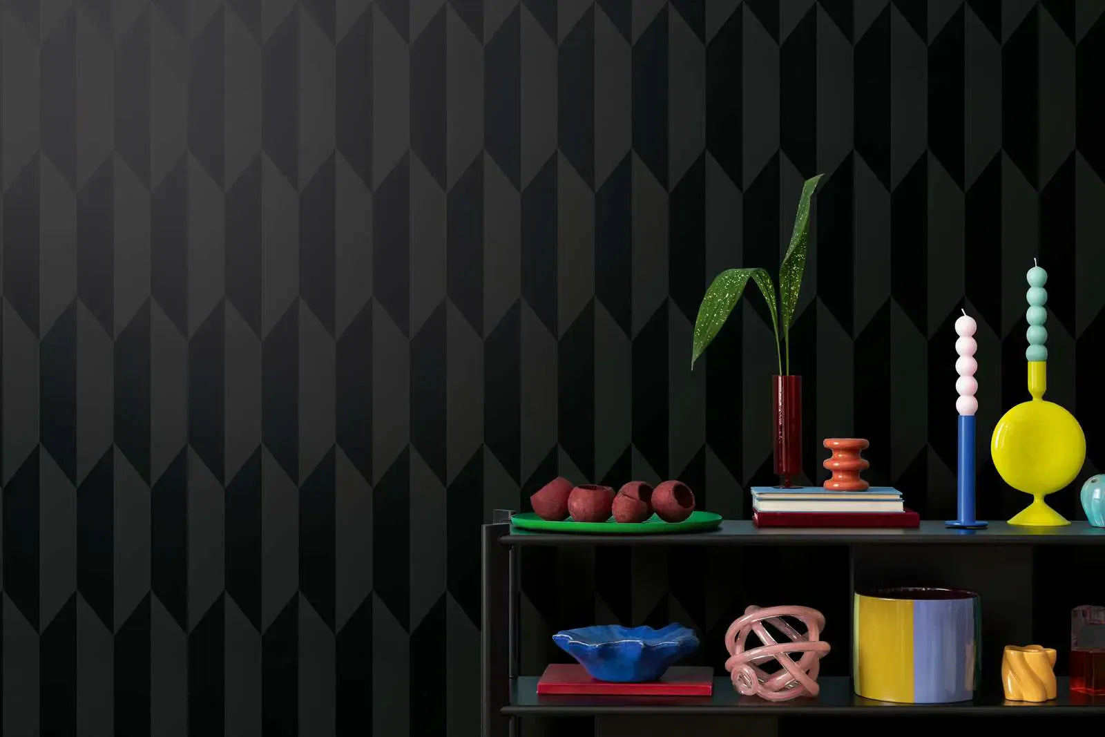 . Tapetų raštą sudaro griežtai geometrinis rombų ir paralelogramų išdėstymas, pasikartojantis vertikaliai. Kiekvieną dalį sudaro skirtingi juodos ir antracito atspalviai, todėl pertvarkius paviršius sukuriamas subtilus 3D efektas: susidaro briaunų ir raukšlių įspūdis, tarsi paviršiai būtų trimačiai sulankstyti. Spalvos yra tik tamsios, todėl sukuriama elegantiška, rafinuota ir moderni atmosfera. Atrodo švariai, minimalistiškai ir santūriai, tačiau kartu pabrėžia grafinį raštą, kurį sukuria šviesos ir šešėlių žaismas. Poveikis yra ir prabangus, ir avangardinis - tai idealus pasirinkimas erdvėms, kuriose norima stipraus gylio efekto ir ekstravagancijos.