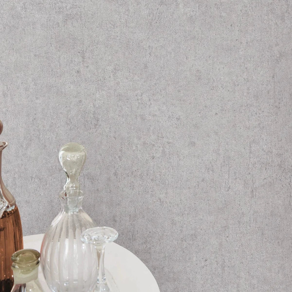Pelēkas tapetes ar apmetuma faktūru sienām – apskatīt istabā Erismann