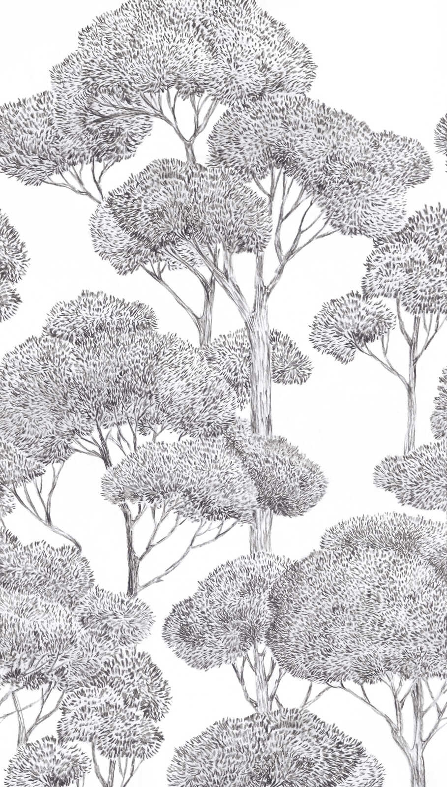 Šis tapetų raštas yra subtiliai išdirbti medžiai su tankiais, šiek tiek išaugusiais lapais. Ilustracija atrodo kaip detalus piešinys tušu, kuriame nesuskaičiuojamos plonos linijos formuoja medžių lapų struktūrą ir sukuria apimtį. Spalvų paletė yra juoda ir balta, o tai suteikia motyvui elegantišką, santūrų atspalvį ir išreiškia retro estetiką klasikinio gamtos tyrinėjimo stiliumi. Ramios linijos ir spalvų nebuvimas daro peizažą lengvą ir erdvų, o iš eilės išdėstytų medžių vainikų raštas suteikia patalpai natūralią harmoniją ir gilumą. Dizainas spinduliuoja šiuolaikinio paprastumo ir amžinos artimumo gamtai derinį.