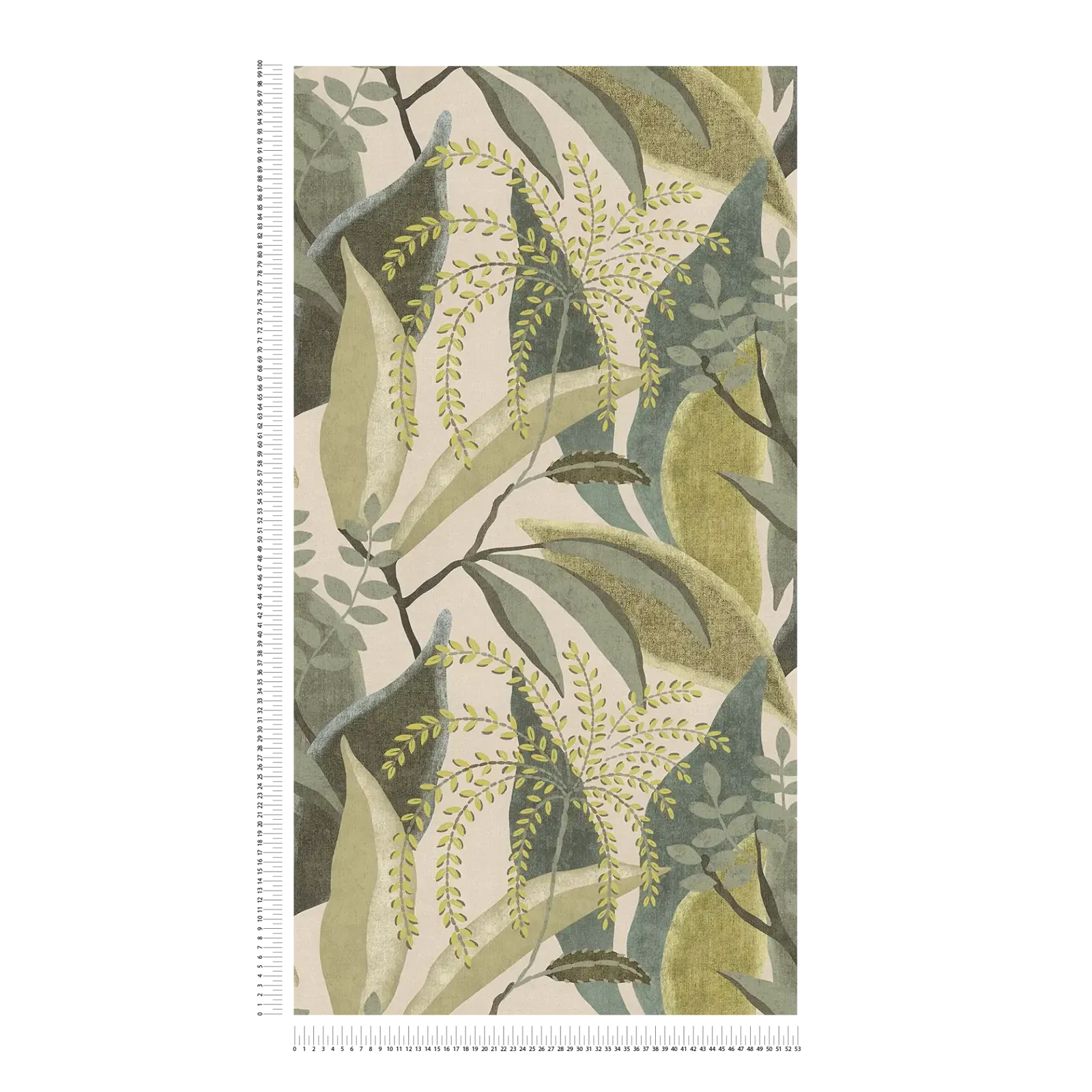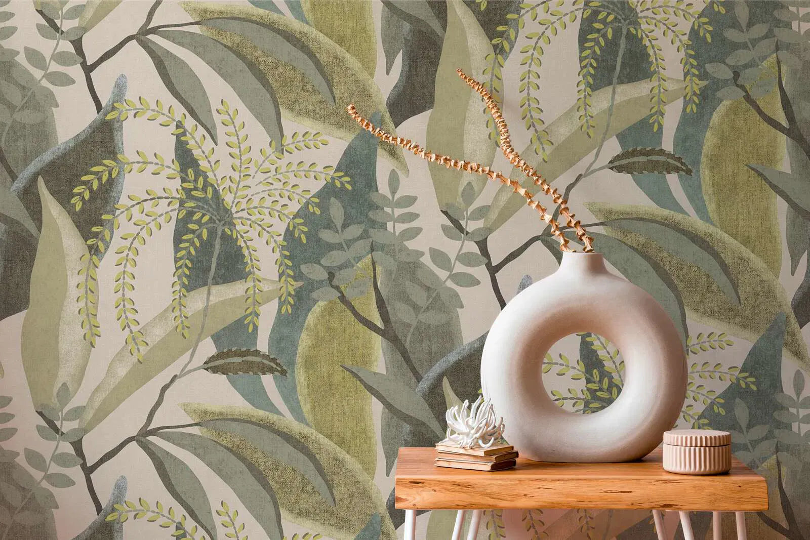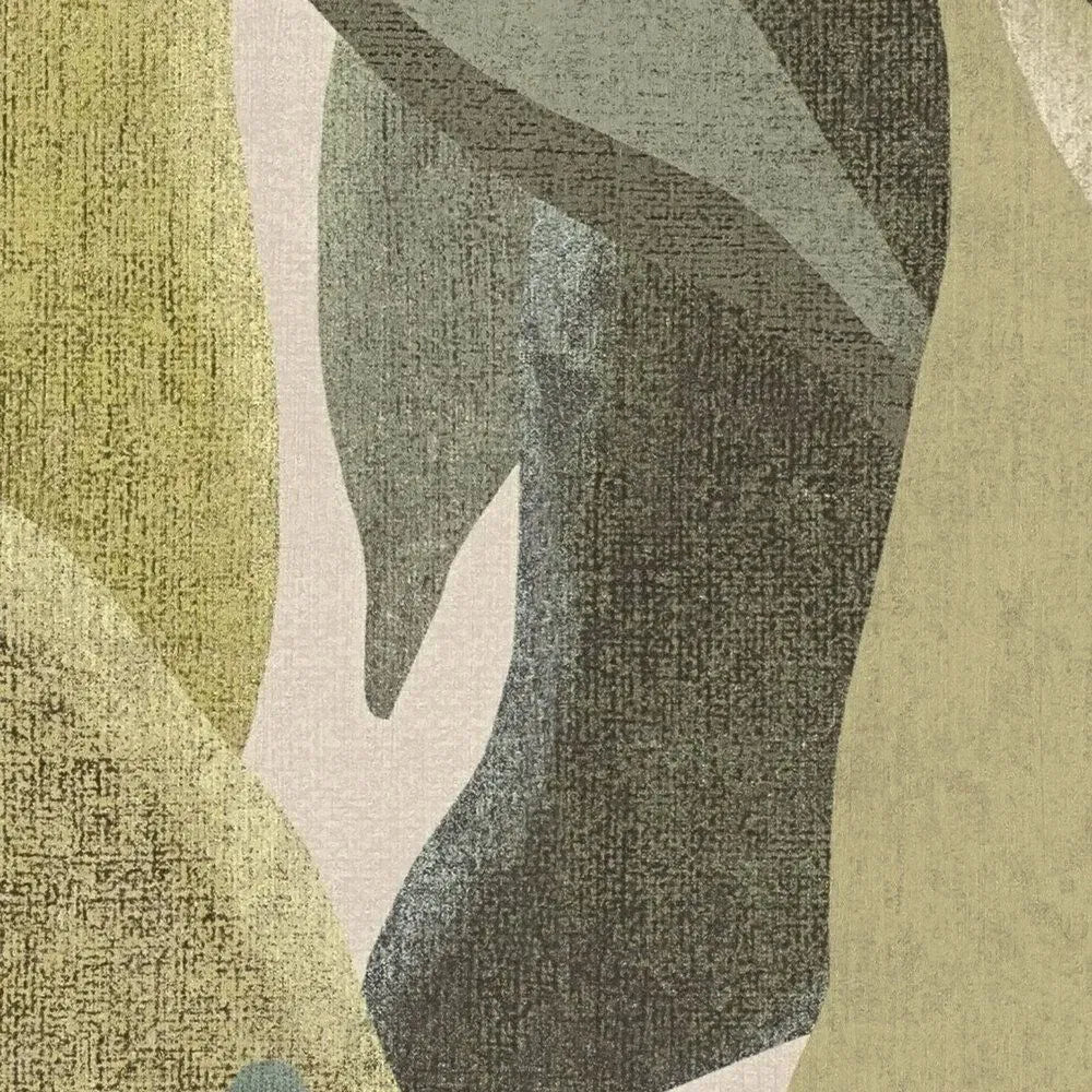 Didelės, organiškai išlenktos lapų formos ir stilizuotos šakos įvairių žalios ir geltonos spalvų atspalvių sudaro šių tapetų motyvą. Tekstūruotas paviršius šiek tiek išblukina spalvas ir atrodo tarsi būtų tapytas rankomis, sukurdamas natūralų, beveik eskizinį vaizdą. Šiek tiek išlenkti, sluoksniuoti lapų motyvai alyvuogių, samanų ir gegužės žalios spalvos sukuria gyvą foną ant kreminės spalvos pagrindo. Virš jo laisvai tekančios šakų linijos su mažais, lapų formos elementais draugiško šviesiai geltono atspalvio suteikia dizainui lengvumo ir dinamiškumo. Natūralių spalvų ir abstrakčių augalų motyvų derinys sukuria šviežią, raminančią atmosferą su subtilia retro nuotaika ir moderniais akcentais.