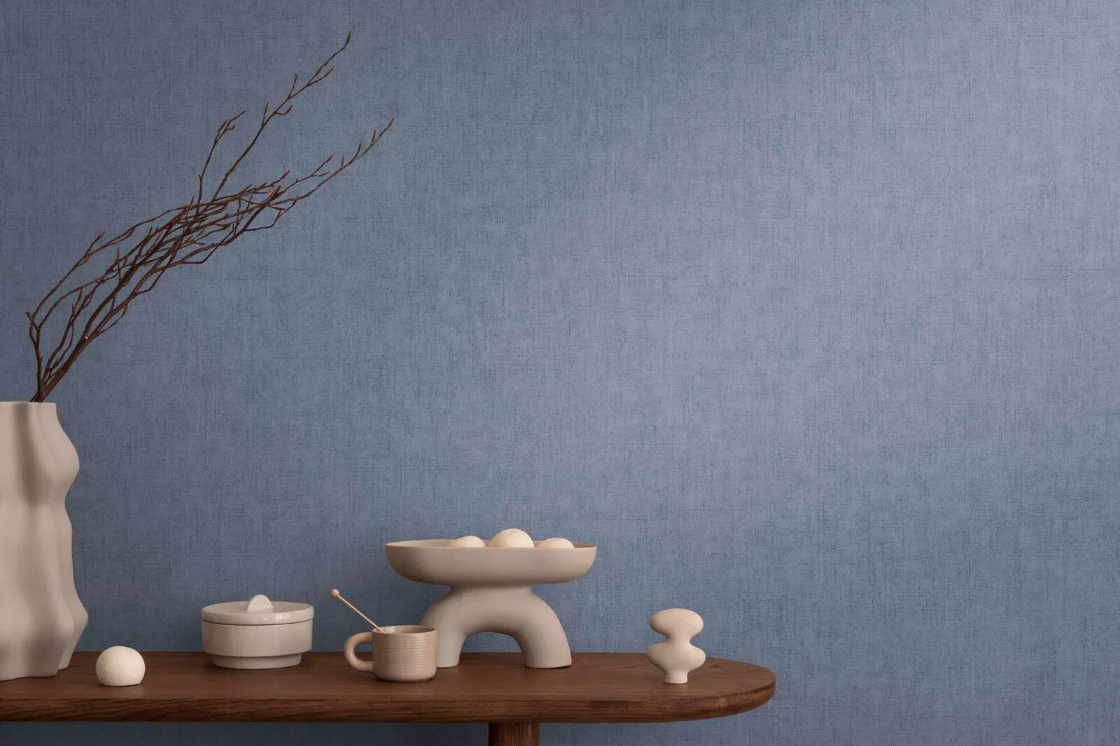 Обои имеют тонкую, похожую на текстиль текстуру с нежным пестрым рисунком. Поверхность слегка неровная и напоминает тонкий лен, создавая тонкий эффект глубины. Цветовая палитра - прохладный средне-синий с едва уловимыми оттенками светло- и темно-синего, создающими спокойную и сдержанную атмосферу. Ненавязчивый дизайн придает помещению современный, элегантный оттенок и делает обои универсальными - они одинаково хорошо подходят в качестве спокойного фона в гостиных и офисах. Матовая фактура подчеркивает впечатление натуральности материалов и гарантирует, что при всей своей простоте Рисунок выглядят живыми.