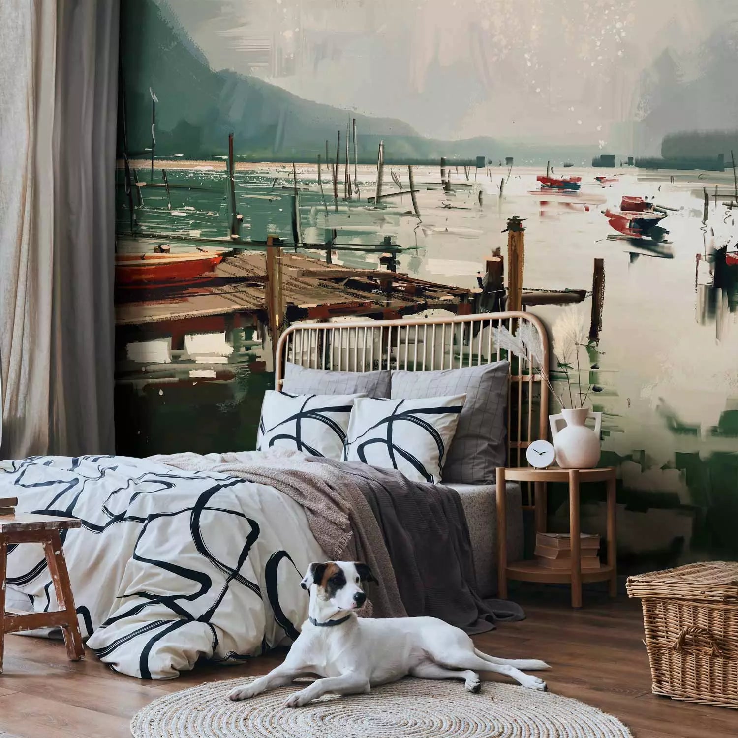 Фотообои - Живописный эскиз, утро, пейзаж с лодкой и горами на заднем плане, 150574