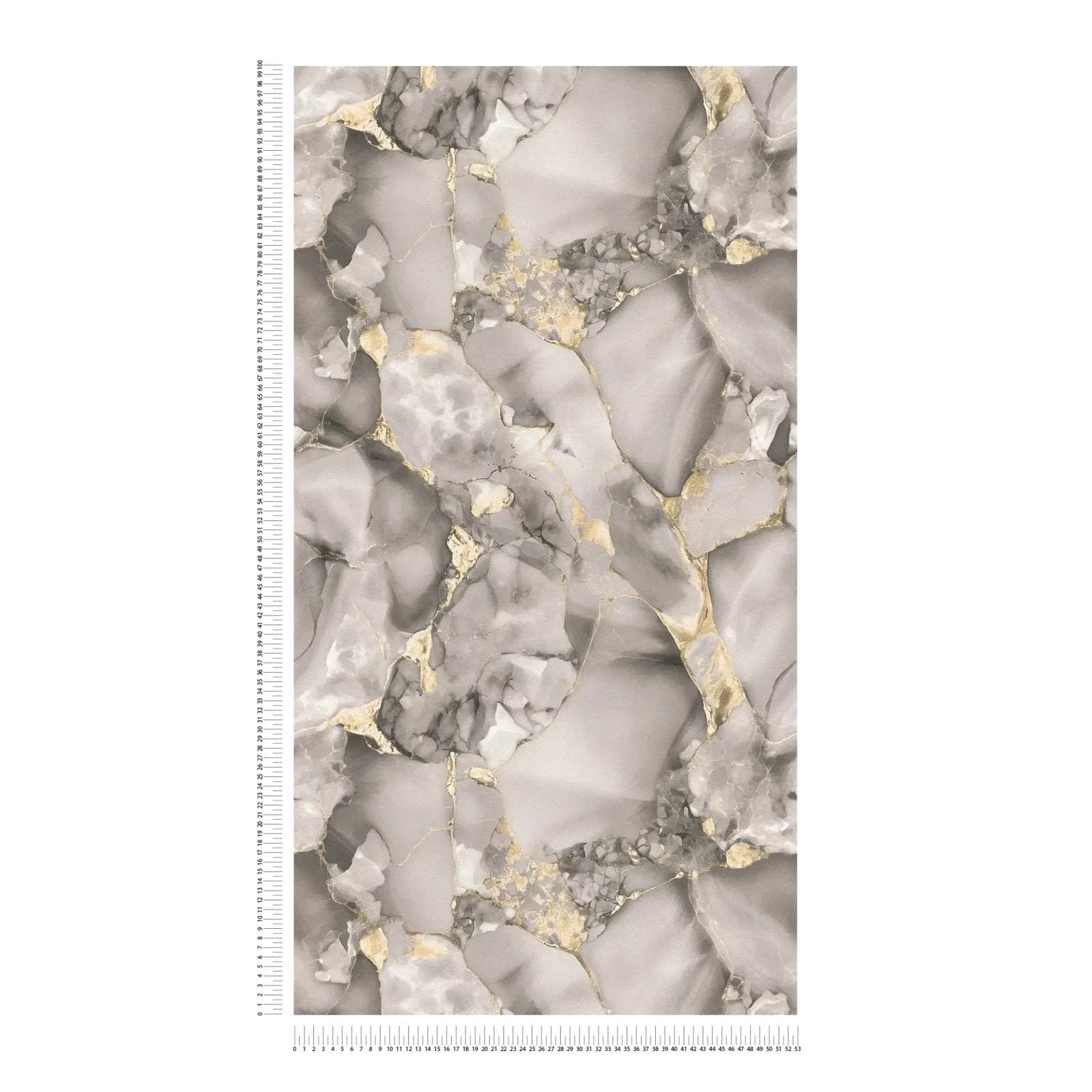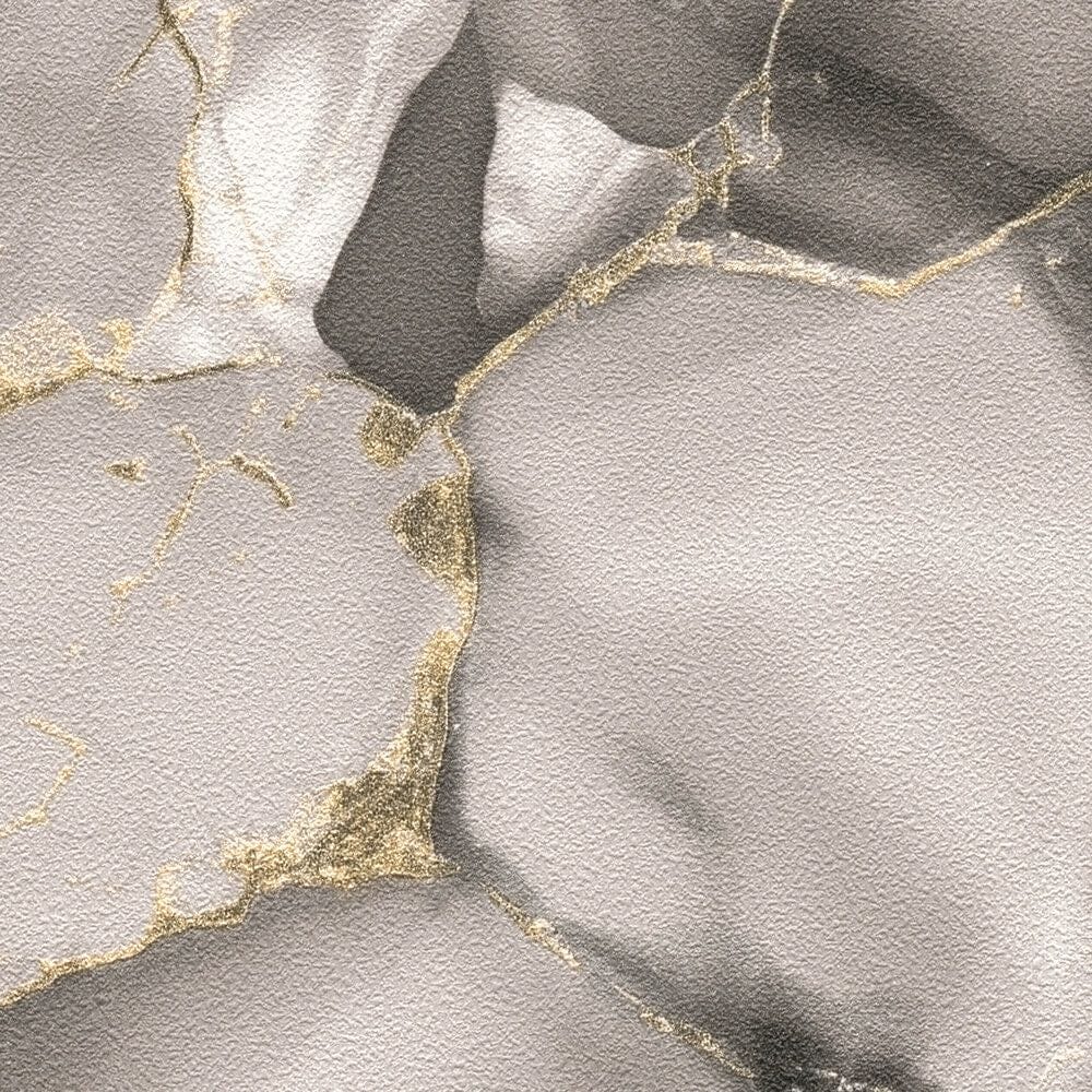 Обои имеют абстрактный мраморный узор, характеризующийся плавными переходами серых оттенков и тонкими золотыми линиями. Мотив напоминает естественные скальные образования или акварельную картину, где золото, как тонкий золотой лист, накладывается на светлые и темные мраморные узоры, создавая элегантные выделения. Цветовая гамма варьируется от нежного светло-серого, глубокого антрацита и выразительных золотых акцентов, создавая роскошную, но в то же время современную и вечную атмосферу. Стиль изысканный и художественный, почти как изысканная интерпретация кинцуги – японского искусства ремонта сломанных вещей с помощью золота. Эффект обоев спокойный, но в то же время живой, и придает любому помещению гламур и эксклюзивность.