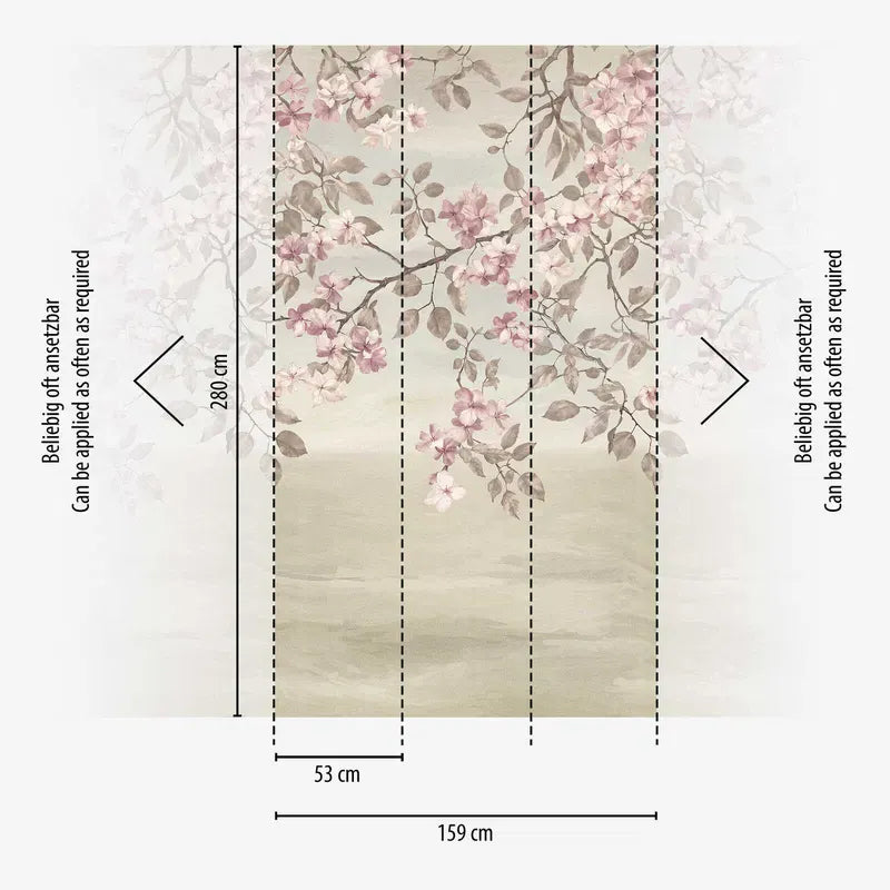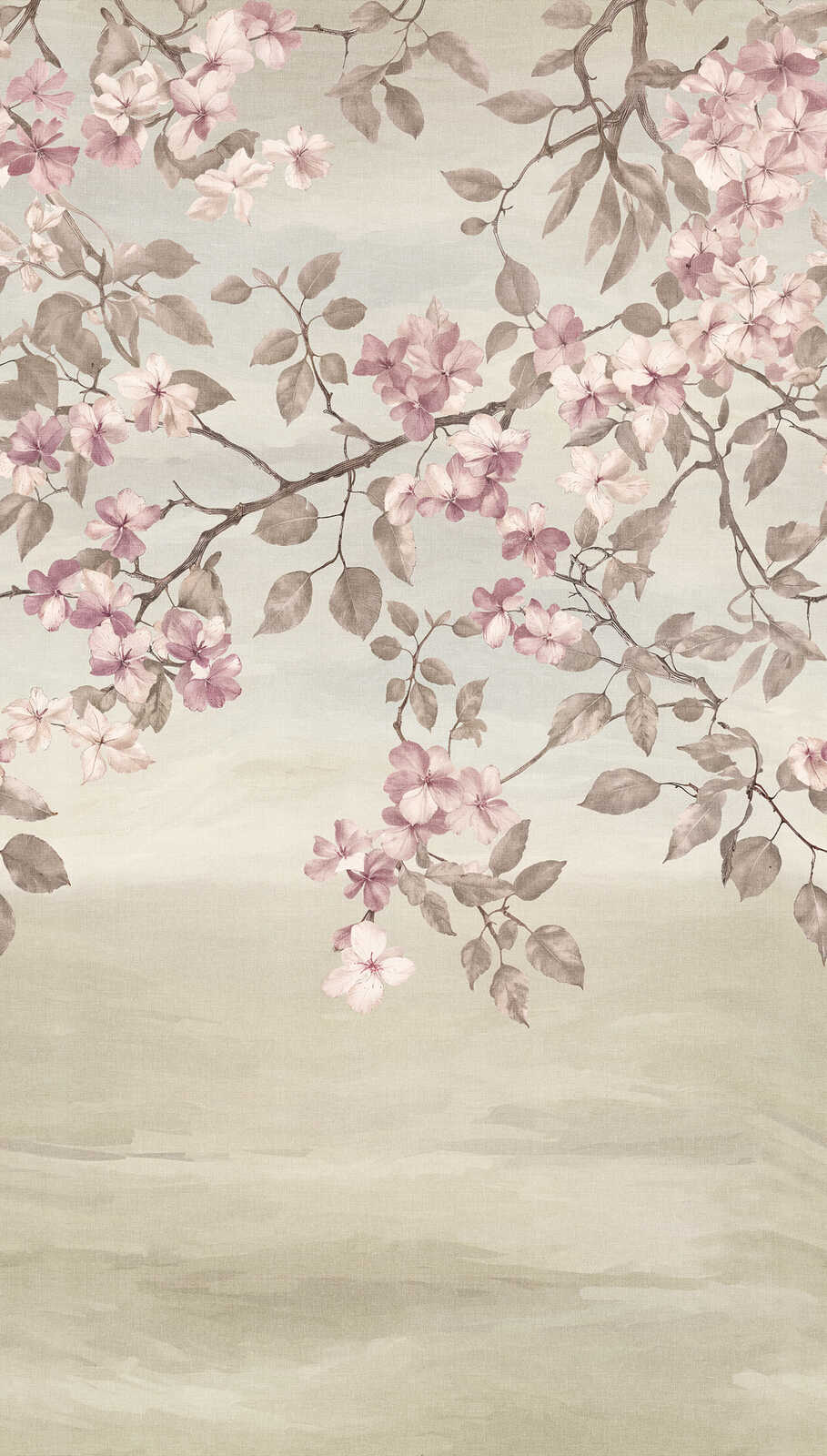 В мотиве преобладают нежные акварельные цветы сакуры, которые играют с плавно изгибающимися ветвями и нежными серо-зелеными листьями. Цветы представлены в различных оттенках - от бледно-розового до сиреневого и пастельно-фиолетового - и создают спокойную, почти мечтательную атмосферу. Фон состоит из плавно перетекающих друг в друга областей светло-бежевого и зеленого цветов, которые придают мотиву глубину, не перегружая его. Все обои имеют элегантный, слегка ностальгический винтажный характер с цветочными элементами в азиатском стиле, которые создают особенно успокаивающий и гармоничный эффект. Цветовая палитра помогает сделать комнаты больше и светлее и создает вневременную, романтическую атмосферу.