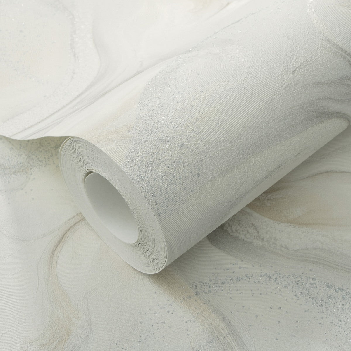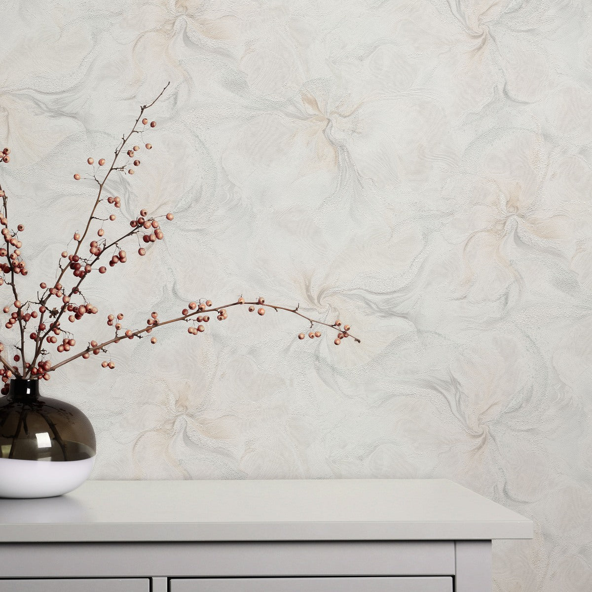 Элегантная имитация камня. Органические мраморные вихри светло-серого и белого цветов с эффектом мерцания придают помещению роскошь и холодную элегантность.