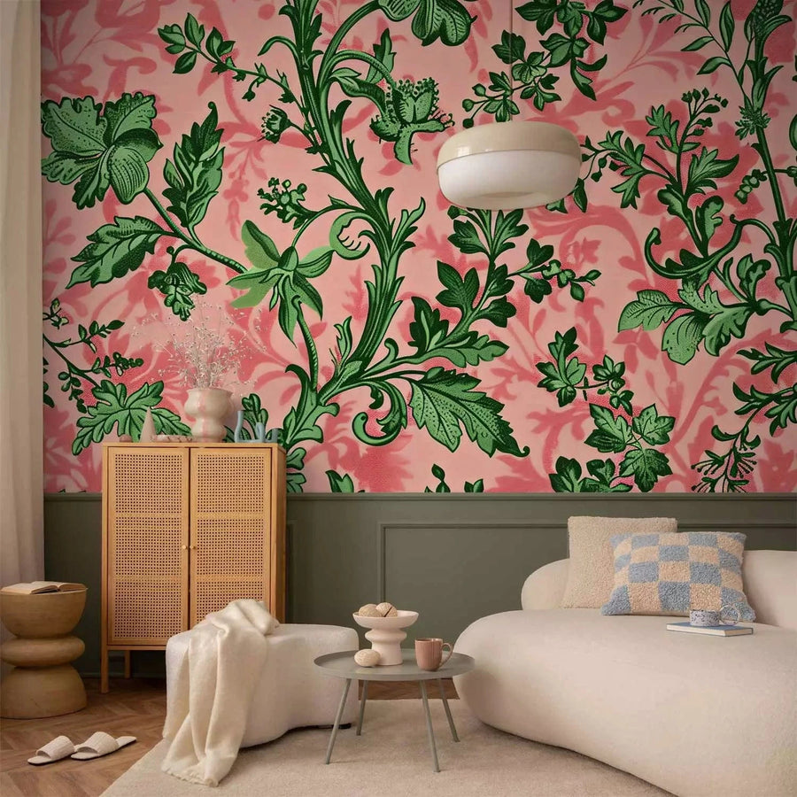 Фотообои - Зеленые листья - классические цветочные мотивы на розовом фоне, 160412