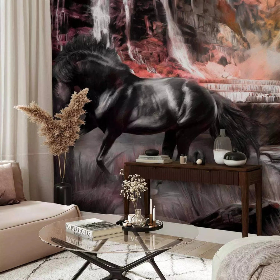 Fototapetes ar zirgu - Melns zirgs pie ūdenskrituma - pirkt G-ART