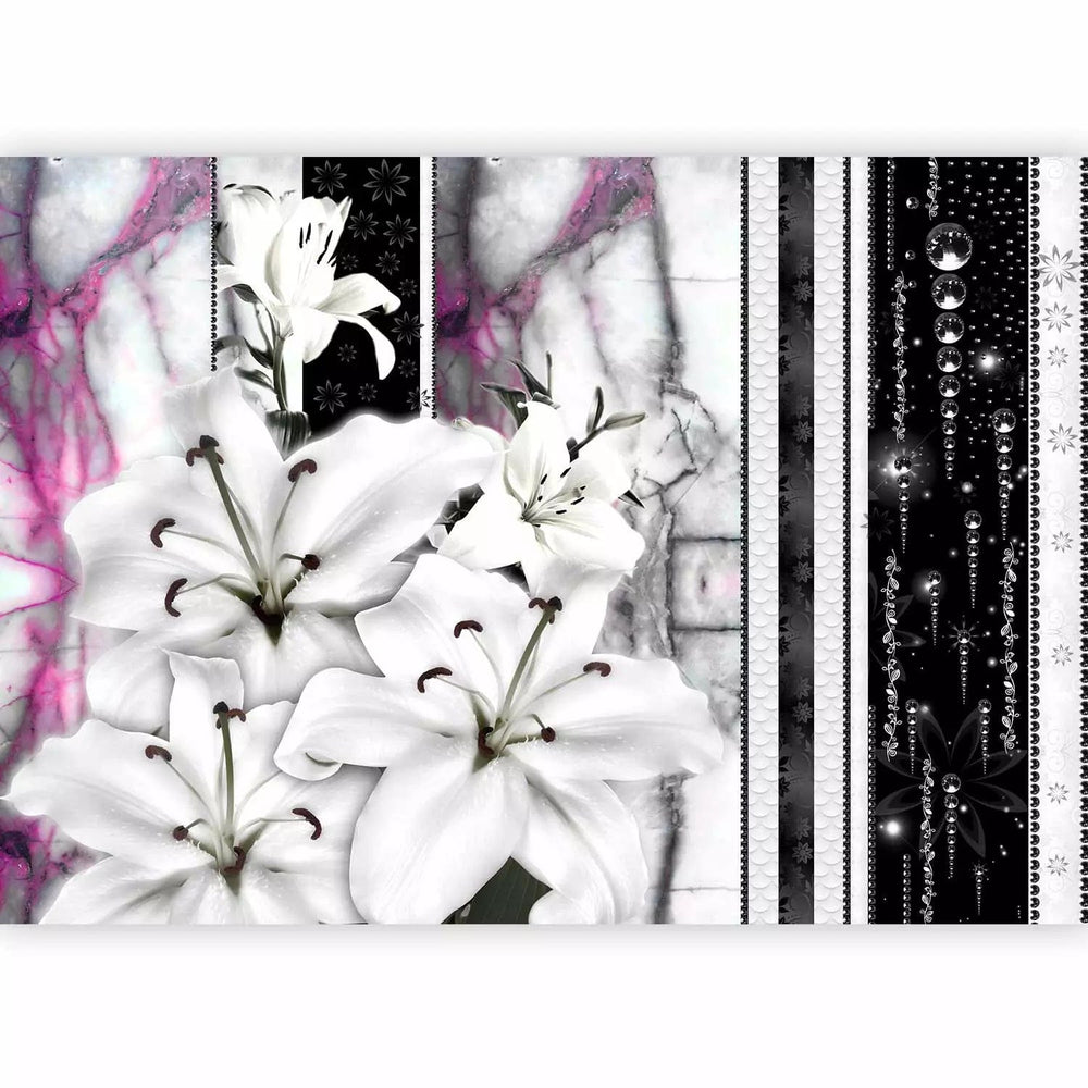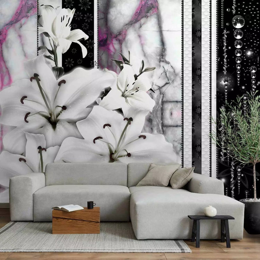 Fototapetes ar baltam lilijam uz melna fona un violetu marmoru, 60725  G-ART