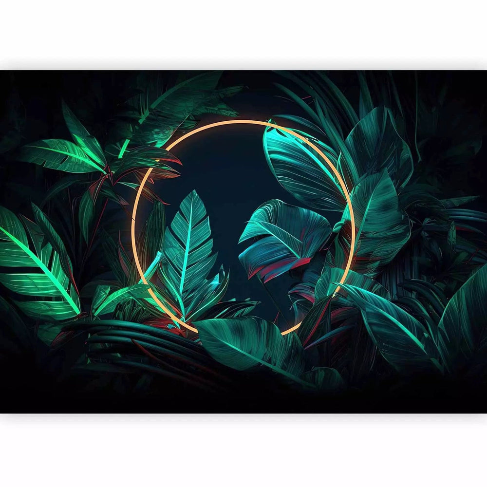 Fototapetes ar džungļiem - Tropu lapas ar neona zelta apli, 150665 G-ART