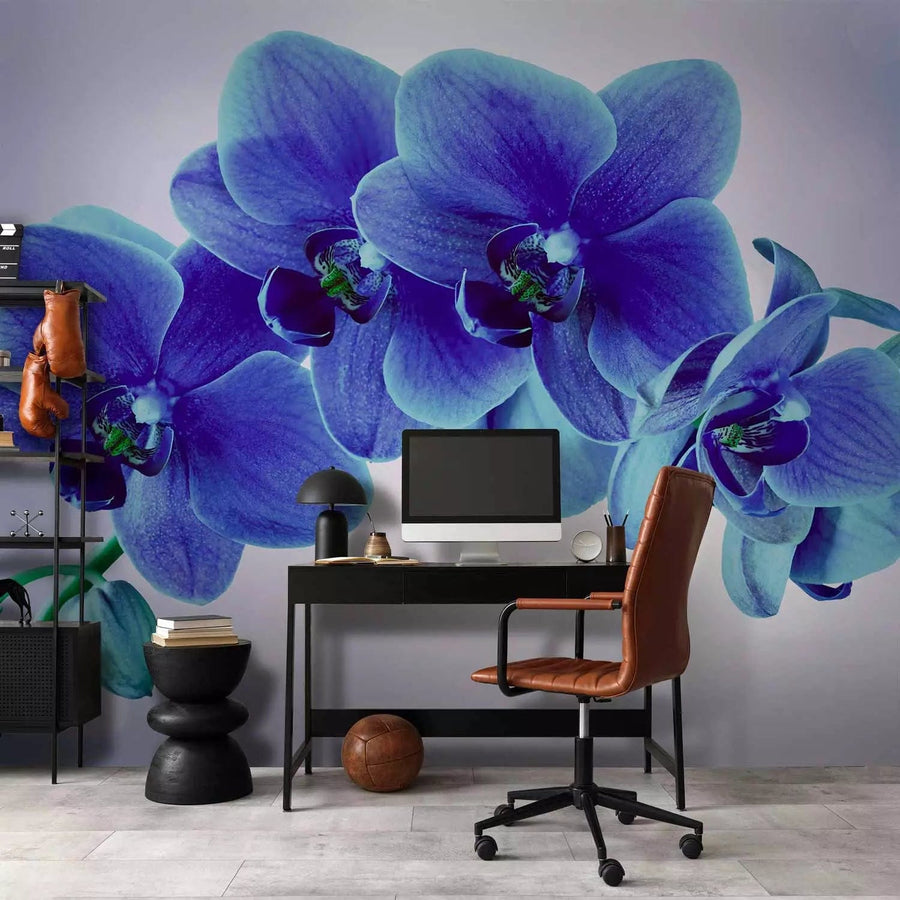 Fototapetes ar orhidejām zilā krāsā uz zila fona- Vienotības mirkļi G-ART