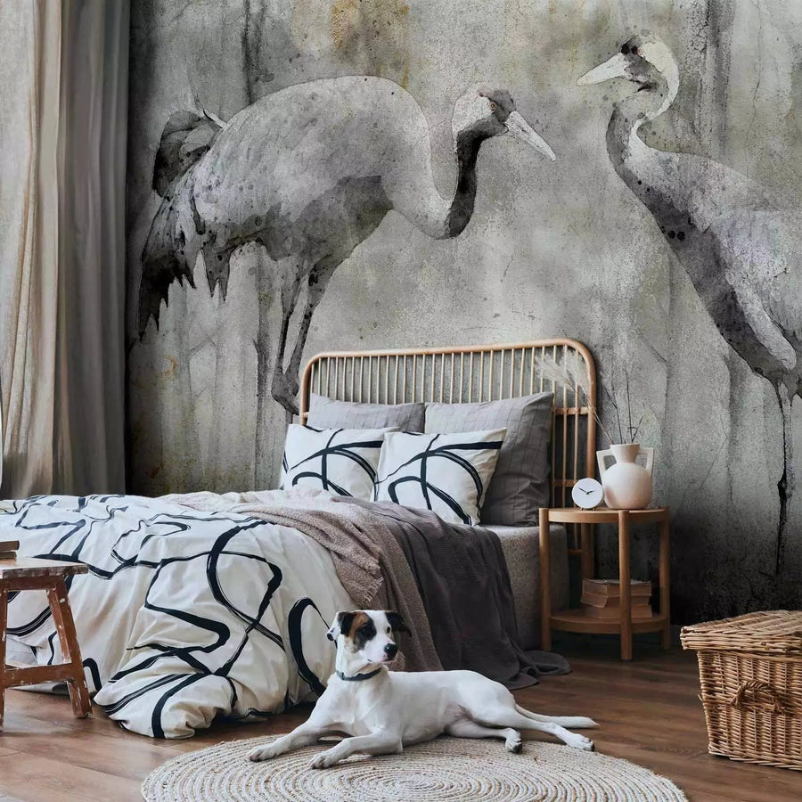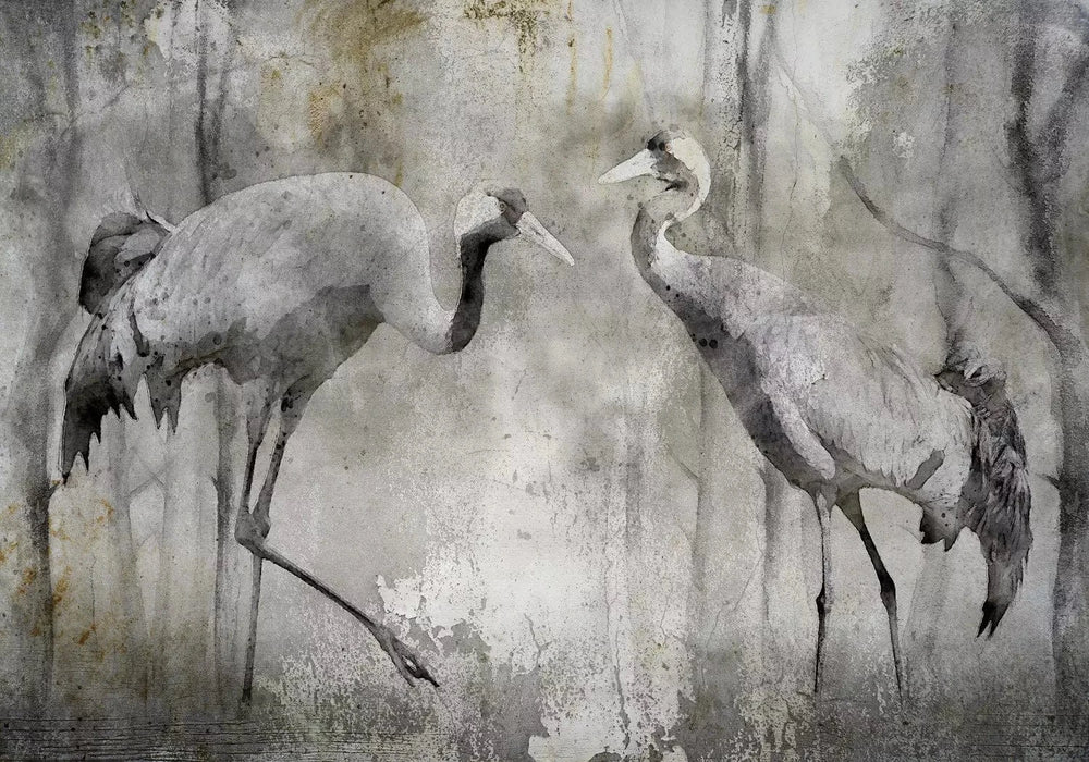 Fototapetes ar dzērvēm pelēkos toņos vintāža stilā - austrumu stils G-ART