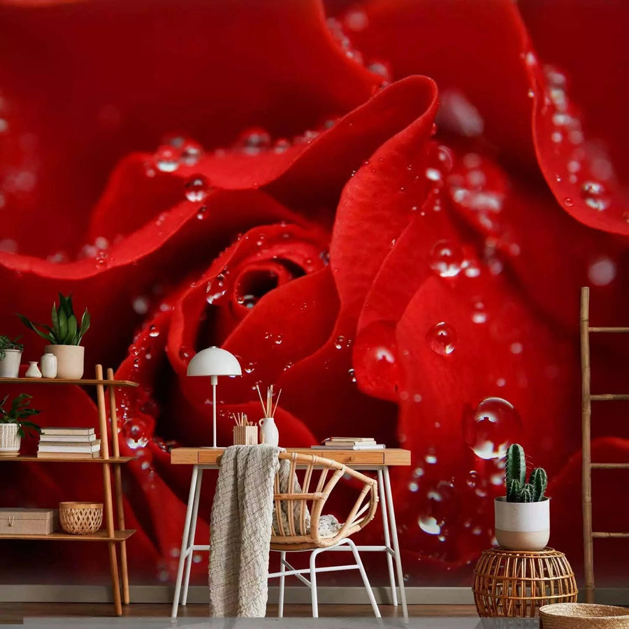 Fototapetes ar rozēm sarkanā krāsā - sarkana roze ar ūdens pilieniem G-ART