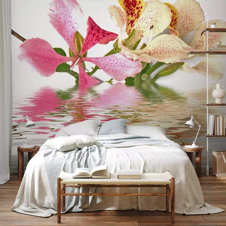 Fototapetes - Orhidejas un krāsains ziedu motīvs uz balta fona G-ART