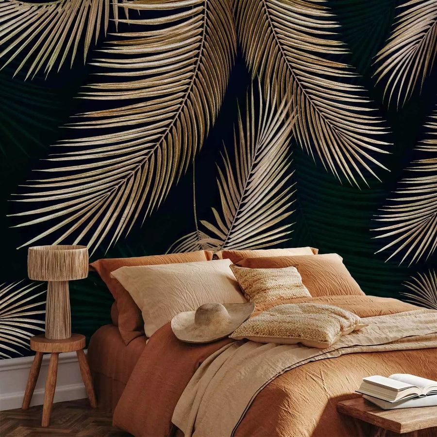 Fototapetes - Eksotiskā veģetācija – palmu lapu motīvs melnā, zeltā G-ART