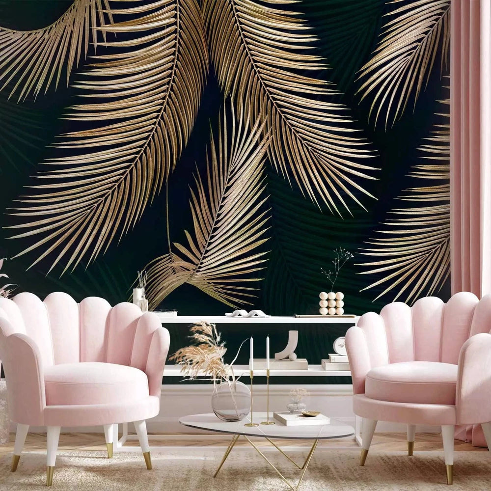 Fototapetes - Zelta palmu lapas uz melna fona - elegants interjers G-ART