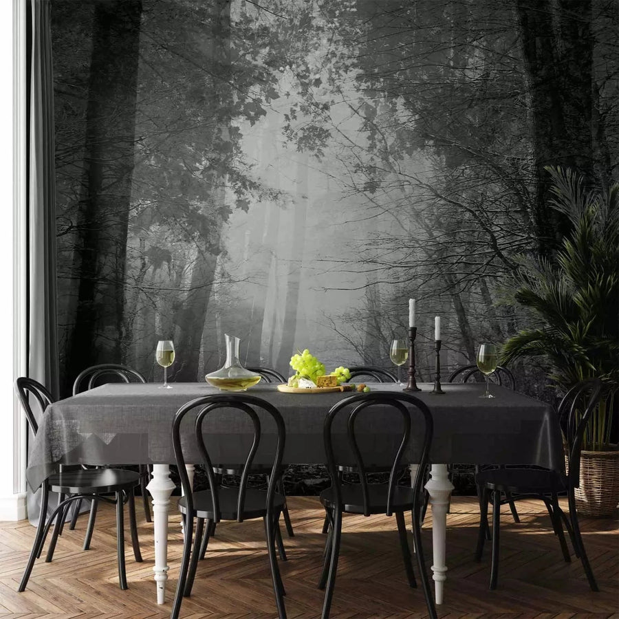 Fototapetes - Melnbalta ainava ar lapām klātu taku meža ielokā G-ART