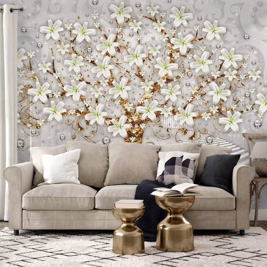 Fototapetes ar lilijām 3D tunelī - gaiši pelēkā krāsā G-ART