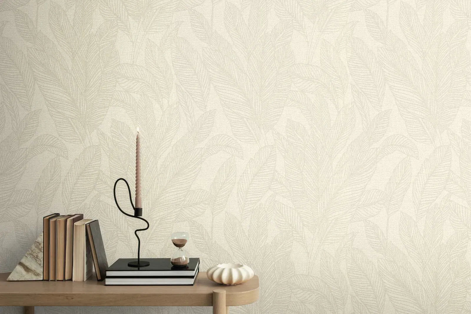 Tapetes motīvs attēlo smalku, gandrīz toņu uz toņa lapu rakstu, kas diskrēti iekļauts gaiši smilškrāsas fonā. Lapas ir nedaudz stilizētas un izskatās maigi savītas, radot atturīgu, no dabas iedvesmotu dizainu. Krāsu gamma sastāv no dažādiem krēmkrāsas un smilškrāsas toņiem, kas rada patīkamu, siltu atmosfēru un padara telpu gaišāku un draudzīgāku. Tekstūra vāji atgādina lina audumu, kas tapetēm piešķir smalku, mājīgu raksturu. Kopējais efekts ir mierīgs, neuzbāzīgs un mūžīgs, padarot tās par ideālu elegantu fona dizainu dažādiem interjeriem.