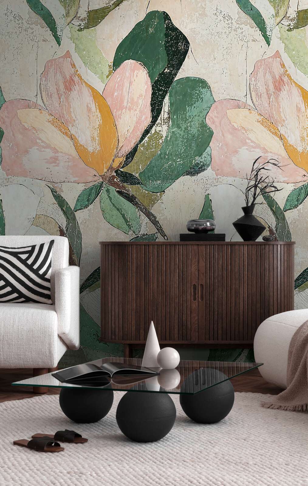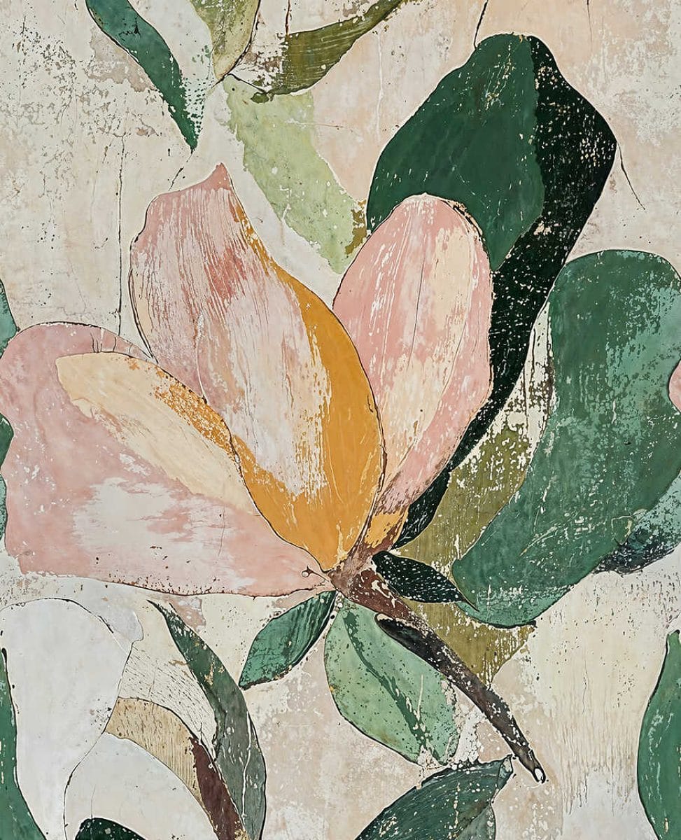 Мотив характеризуется крупными цветочными мотивами со стилизованным винтажным характером. Главную роль играют огромные цветы магнолии нежных оттенков розового и кремового с теплым абрикосовым оттенком в центре. Между ними - листья разного размера, иногда накладывающиеся друг на друга, зеленого, оливкового и темно-елового цветов. Поверхность имеет намеренное старение: текстуры и трещины, как будто обои были изношены или выцвели с годами, придают им очаровательный, слегка потертый вид. Фон остается нежно-песочного или известнякового цвета и подчеркивает естественную, земную элегантность. В целом Рисунок создают спокойную, ботаническую атмосферу с ностальгическими нотками, которая делает привлекательными и художественными как жилые помещения, так и творческие рабочие зоны.