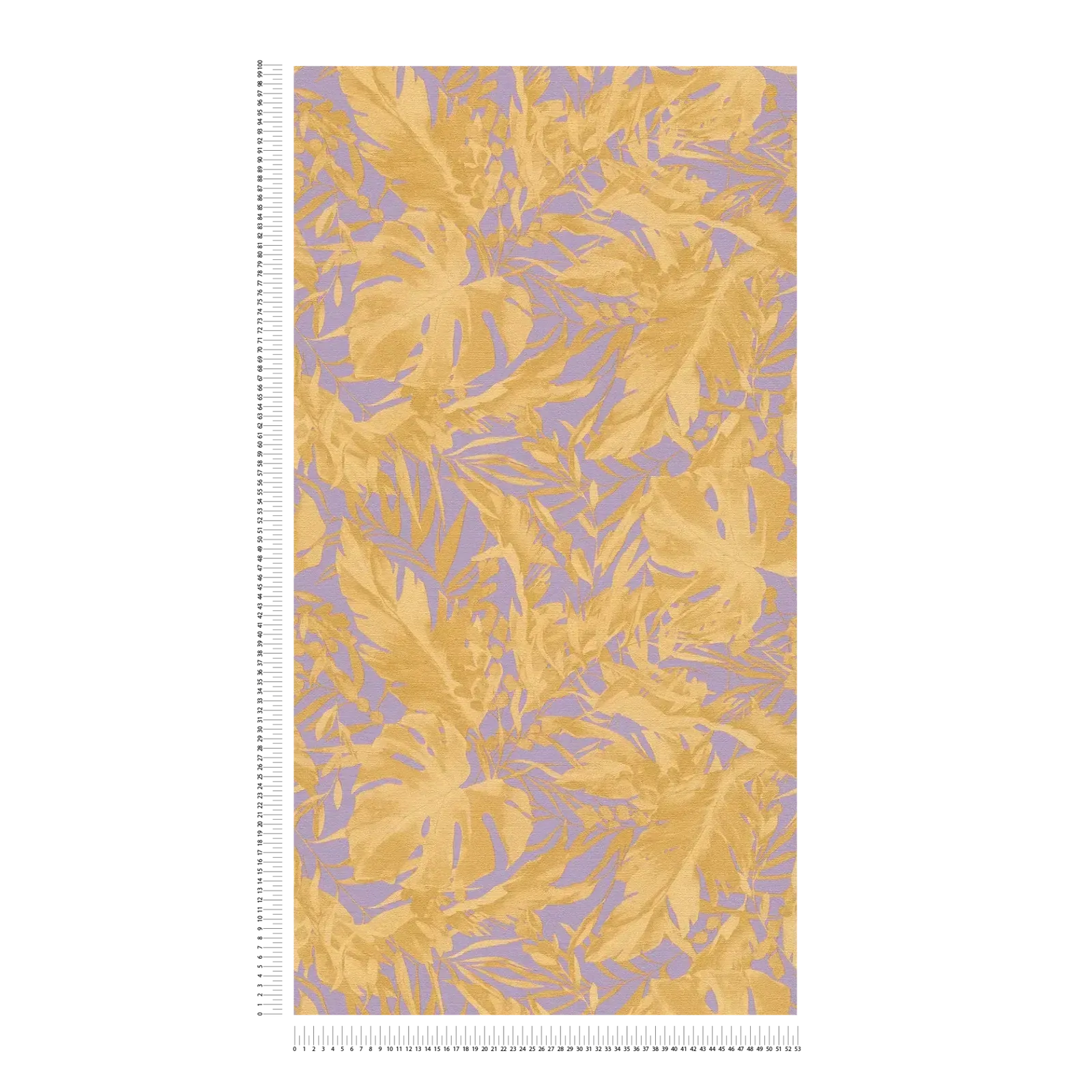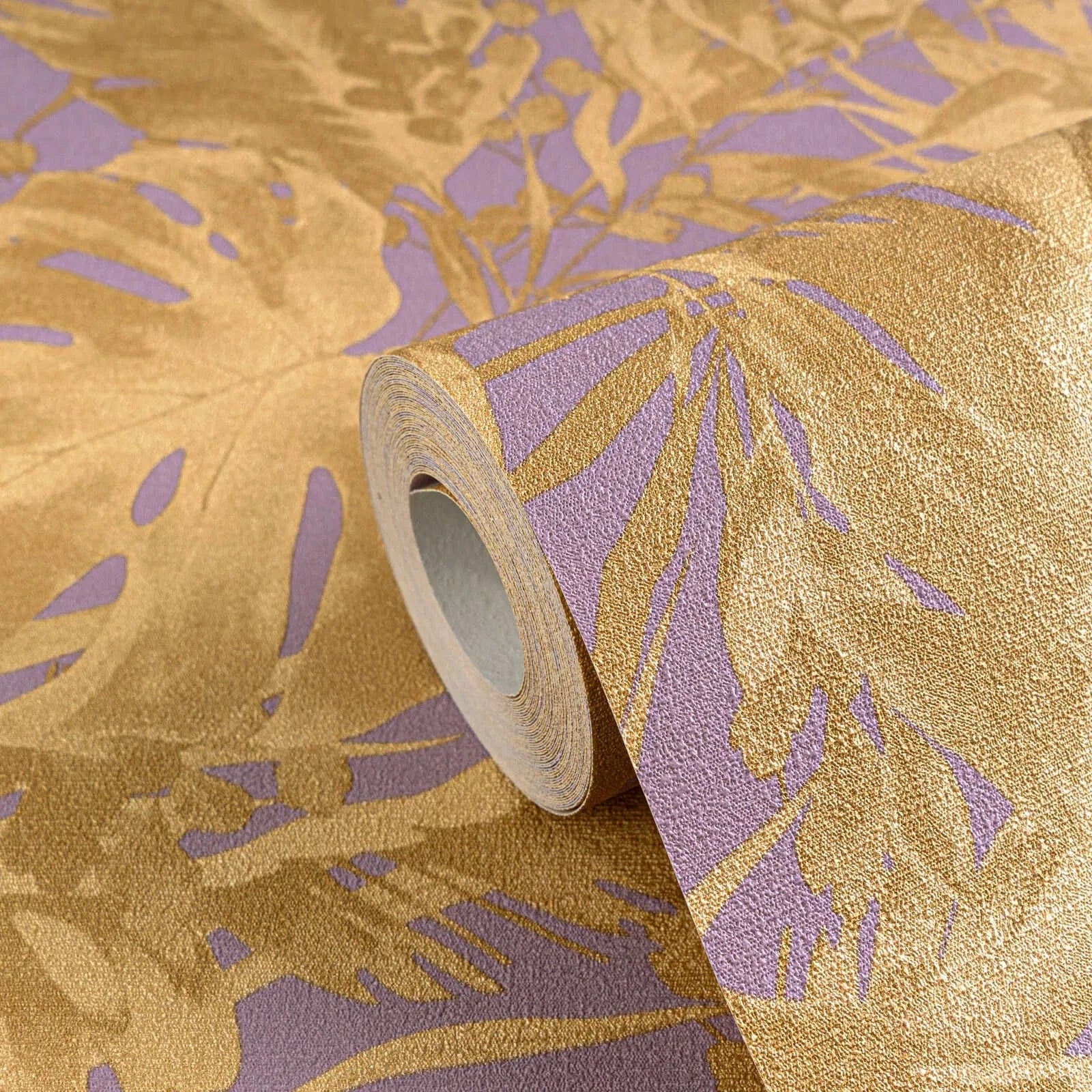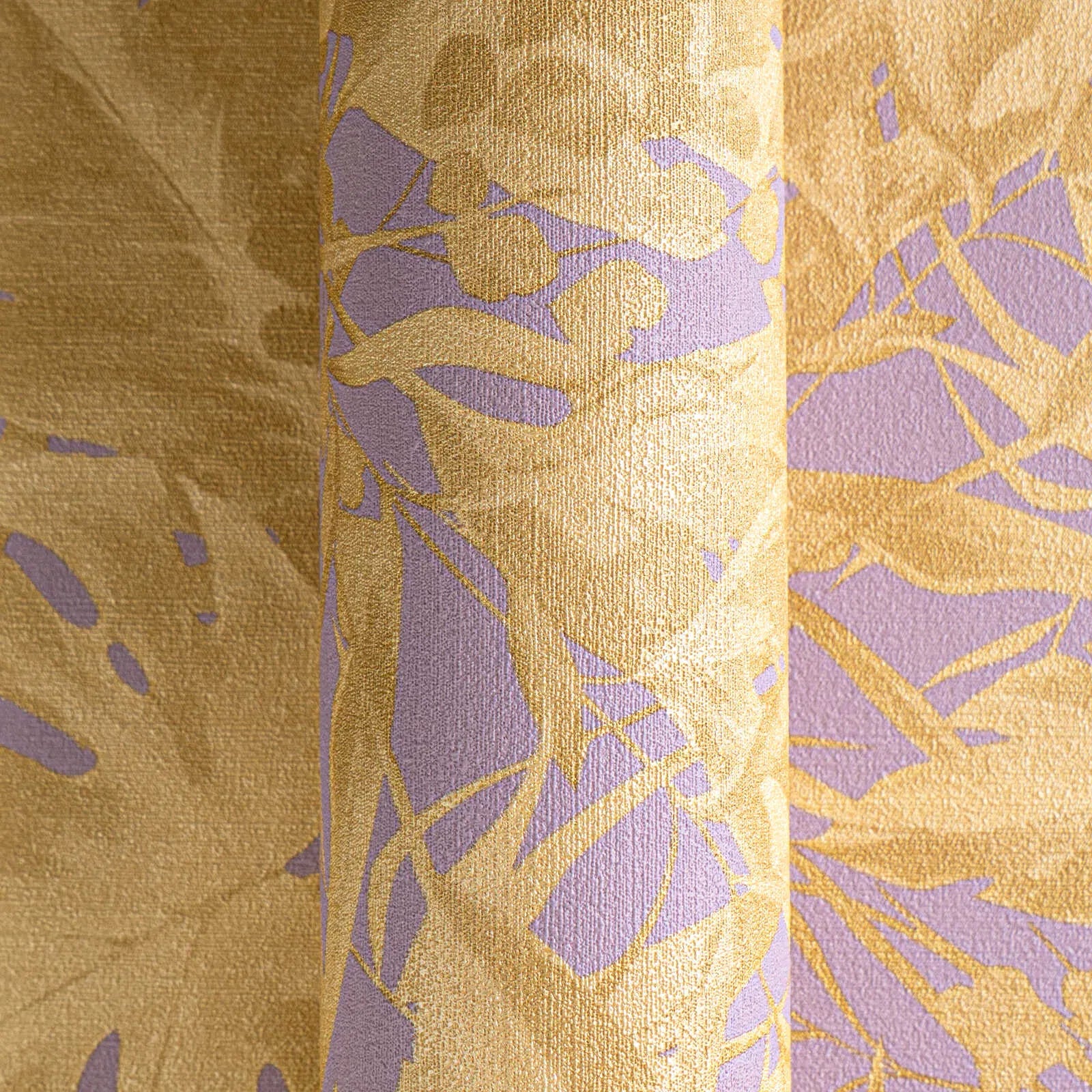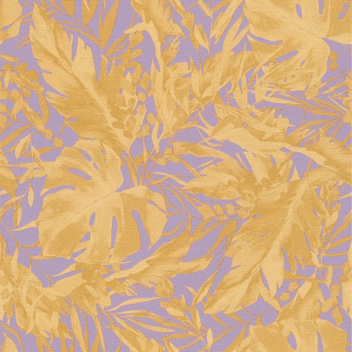 Šīs tapetes dominē blīvs, tropu iedvesmots lapu raksts. Lielas, stilizētas lapas – iedvesmotas no monstera un palmu kokiem – pārklājas ar maigām, plakanām līnijām. Krāsu izvēle sastāv no siltā, zeltaini dzeltenā okera toņa lapām, kas kontrastē ar matētu, pasteļto violeti fona krāsu. Krāsu kombinācija rada draudzīgu, nedaudz eksotisku noskaņu, un gaišo un kluso toņu mijiedarbība rada atsvaidzinošu, dzīvīgu iespaidu ar retro šarmu. Raksts ir dinamisks un rotaļīgs, bet ne uzmācīgs, un atgādina saulainu brīvdienu oāzi.