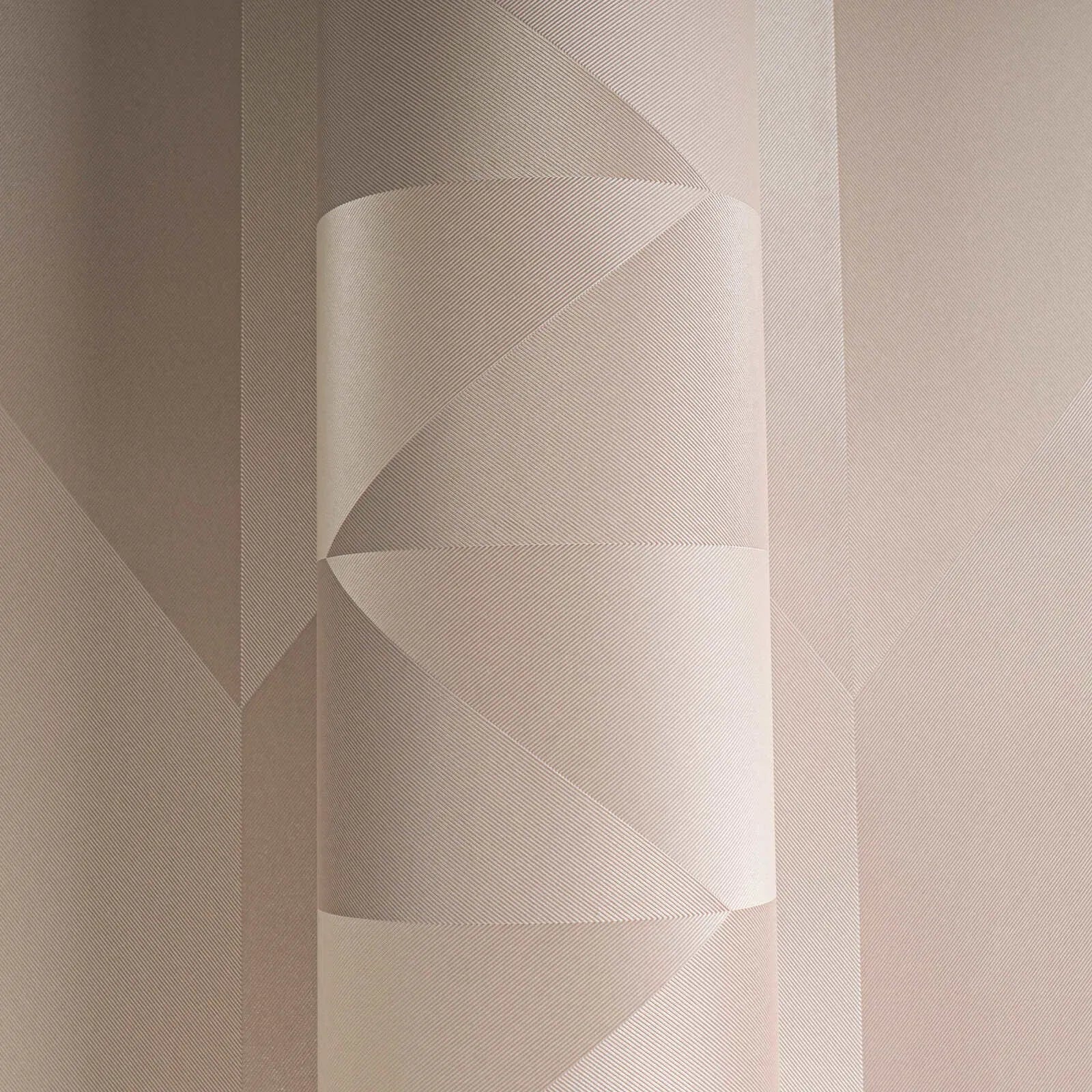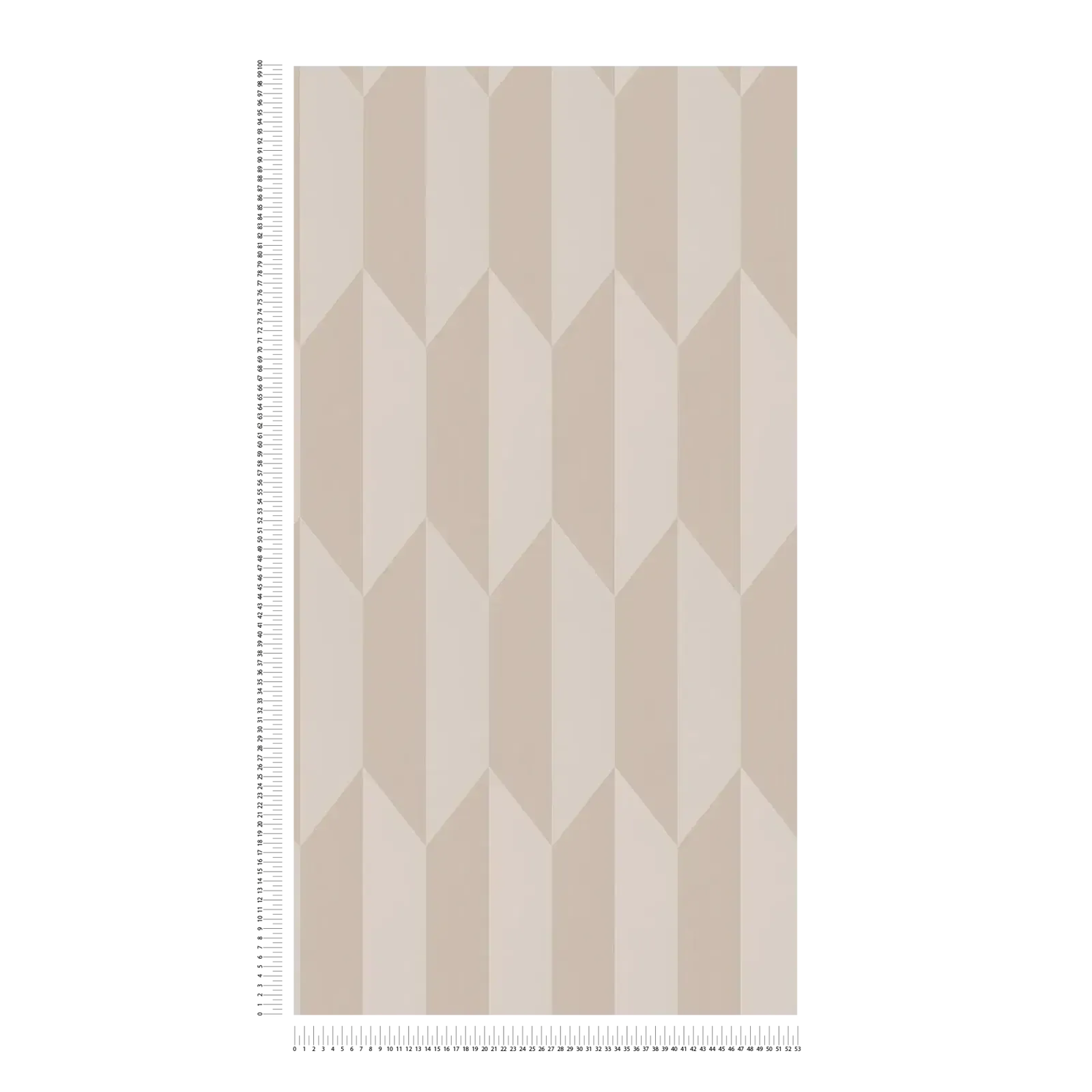 Šo tapetu motīvs sastāv no ģeometriska raksta, kas veidots no vertikāli izkārtotu, dimanta formas figūru secības. Virsmām ir dažādi smilškrāsas un krēmkrāsas toņi, radot smalku trīsdimensiju efektu. Krāsas ir ļoti atturīgas un siltas, gandrīz pūderveida, kas tapetēm piešķir mierīgu un harmonisku atmosfēru. Stils ir moderns un minimālisma, ar nelielu atsauci uz skandināvu vai vidusgadsimta dizainu. Krāsu gradāciju mijiedarbība piešķir rakstam dziļumu, neuzspiežot to, un nodrošina, ka telpa izskatās eleganta un draudzīga vienlaikus.