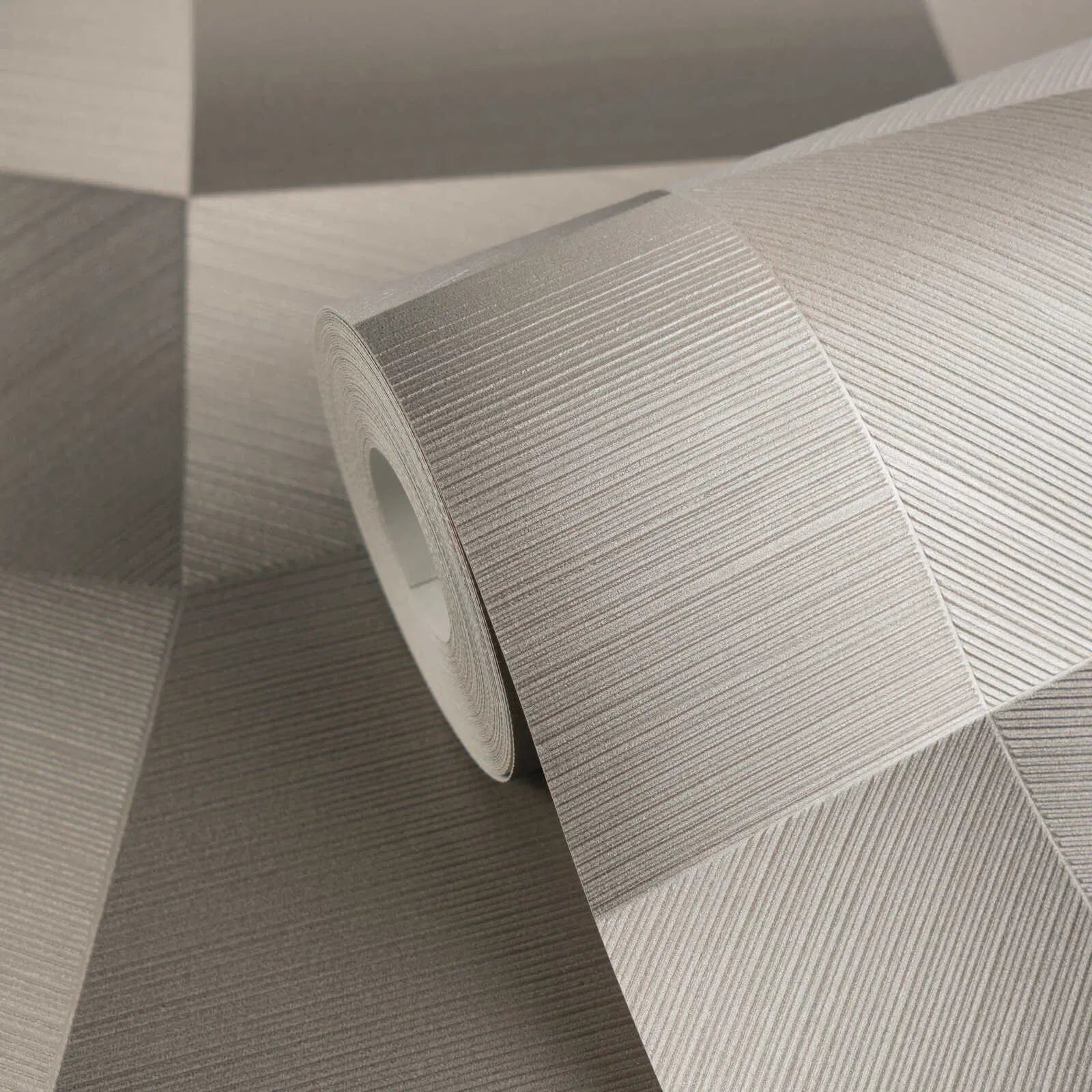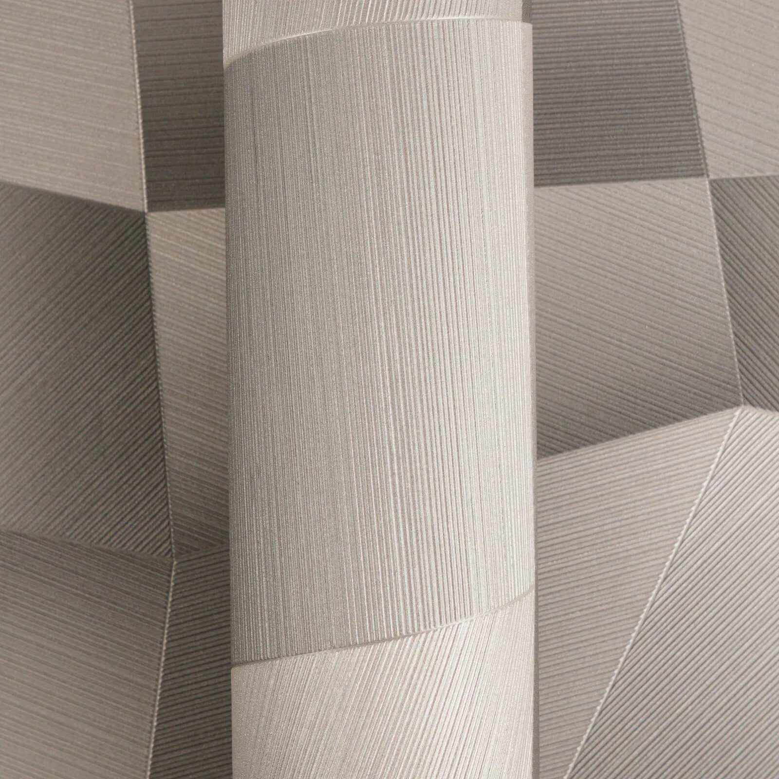Мотив обоев изображает геометрический узор из полированных, как будто переплетенных квадратов, которые напоминают трехмерный 3D-образ. Отдельные области выглядят как элегантно сложенные поверхности, пересеченные тонкими диагональными линиями, создавая впечатление матового металла. Цветовая палитра изысканна, с теплыми серо-коричневыми и серыми тонами, которые меняются в зависимости от игры света и изменения направления. Сочетание холодного металлического вида и мягких цветов создает современную, но сдержанную, элегантную атмосферу, которая придает помещениям глубину и динамизм, не будучи навязчивой.