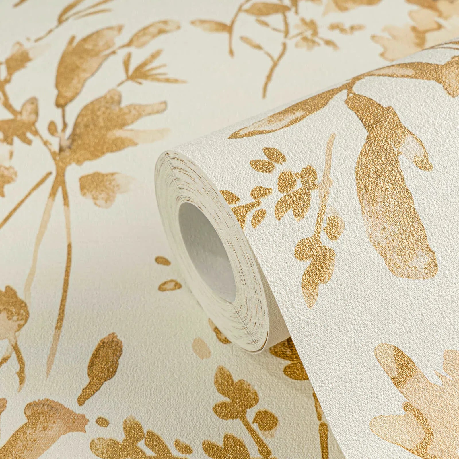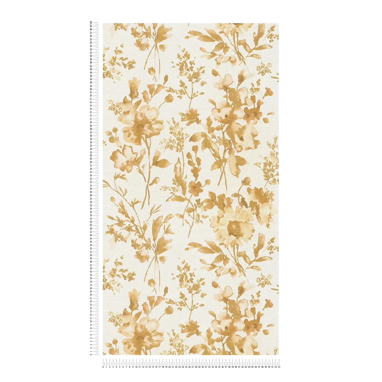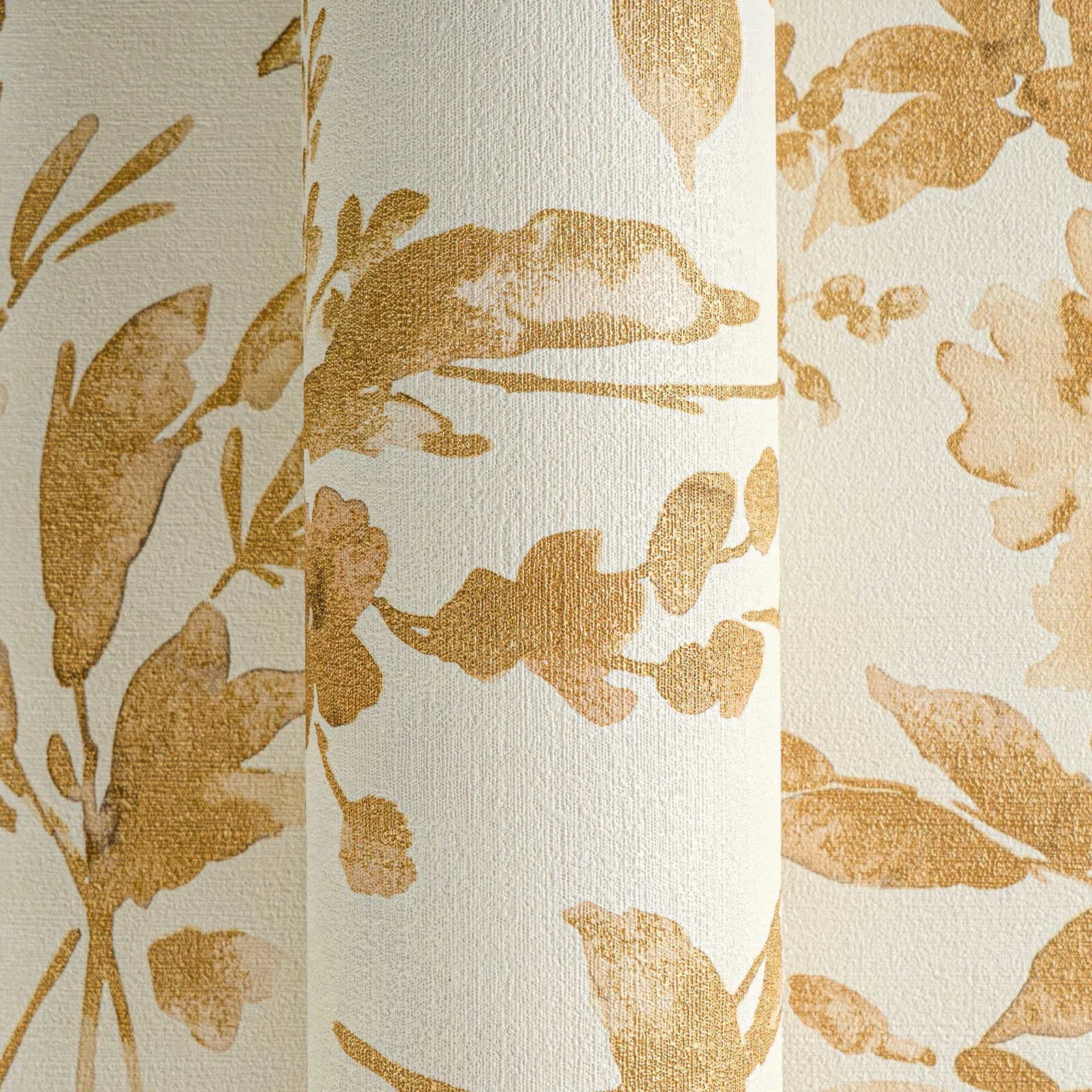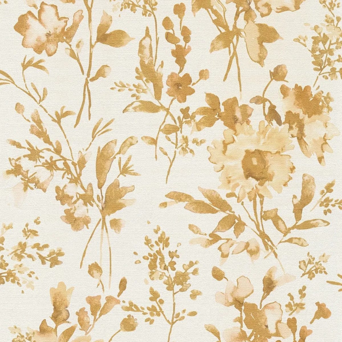 Motīvā dominē delikāti ziedu akvareļu raksti, ar dažādiem ziediem un filigrāniem lapām brūnos un okera toņos, izkaisītiem uz krēmkrāsas fona. Ziedi izskatās brīvi un viegli ieskicēti, piešķirot rakstam smalku, ar rokām gleznotu izskatu. Siltu zemes un smilšu toņu krāsu gamma izstaro mierīgu, dabisku atmosfēru un rada maigu, mājīgu noskaņu. Kombinācijā ar maigajām kontūrām tiek radīta eleganta viegluma sajūta, kas atgādina vintage vai lauku mājas stilu un vienlaikus izskatās moderni. Šis dizains padara telpas draudzīgas un aicinošas, neuzbāzīgas.