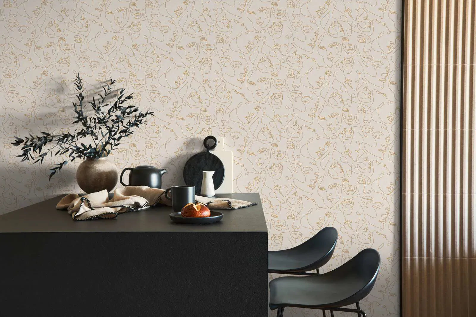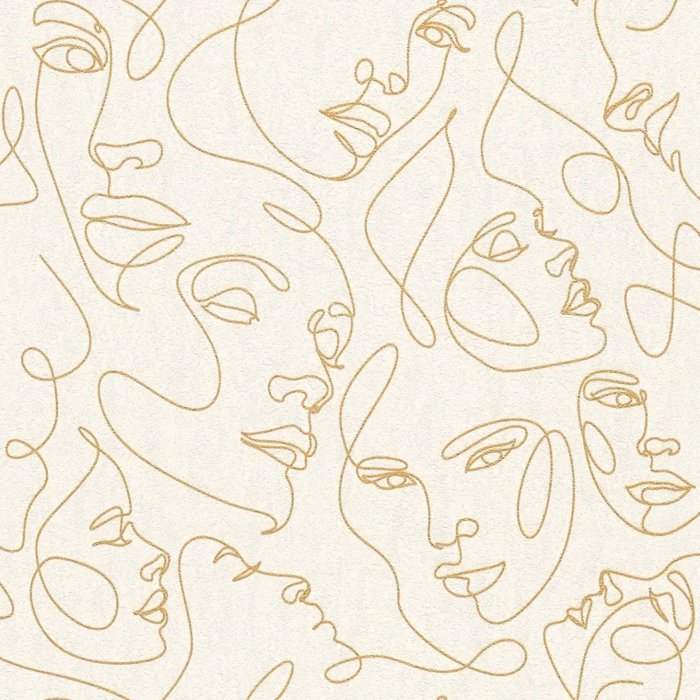 На матовом кремовом фоне текут, казалось бы, бесконечные линии и петли. Линии образуют абстрактные, минималистичные лица с неявными глазами, носами и губами – как будто они нарисованы одним непрерывным движением. Стиль напоминает современное искусство линий и создает художественную, современную эстетическую атмосферу. Теплый золотой цвет создает нежные, роскошные акценты, не навязываясь. Общий вид воздушный, минималистичный и элегантный, создавая ощущение легкости и сдержанной утонченности.