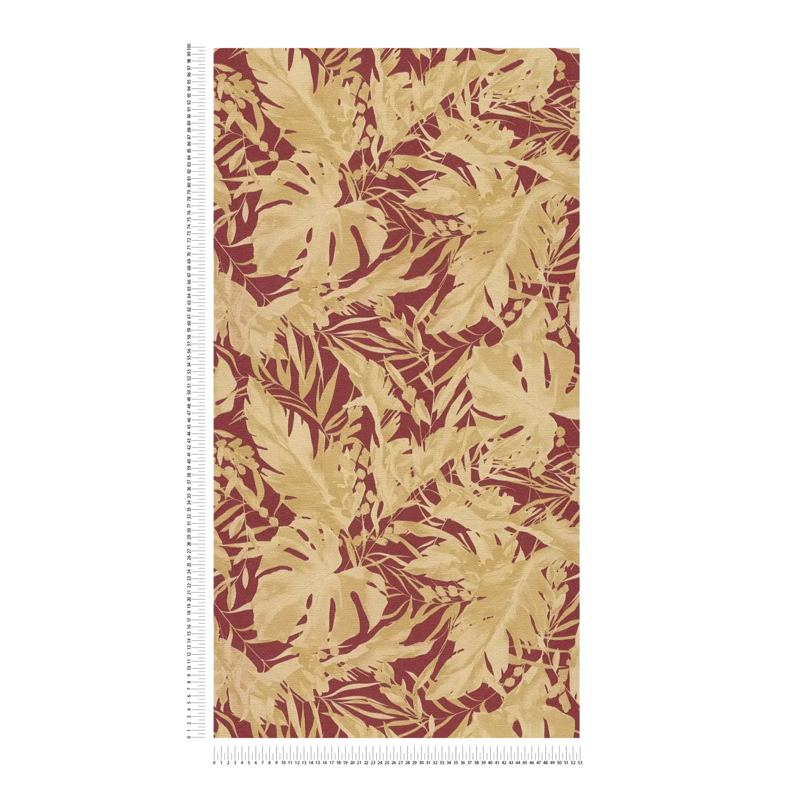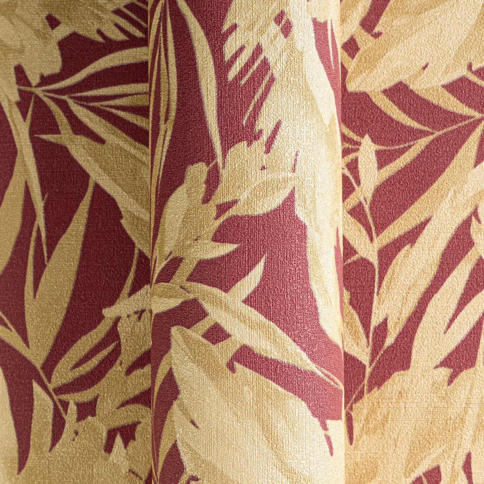 Krāšņs botānisks raksts ar lielām, stilizētām lapām, piemēram, monstera un palmu lapām, kas cieši izkārtotas un pārklājas cita ar citu. Krāsu gamma apvieno bagātīgu, tumši sarkanu fonu ar matētu, siltu smilškrāsu ziedu siluetiem. Krāsu kontrasti izskatās izsmalcināti un piešķir retro šarmu, bet lapas rada tropiskus un eksotiskus akcentus. Mīkstās malas un toņu toņos nokrāsotie toņi rada harmonisku izskatu, kas ir gan dzīvīgs, gan nomierinošs, piešķirot telpām elegantu, mājīgu atmosfēru.