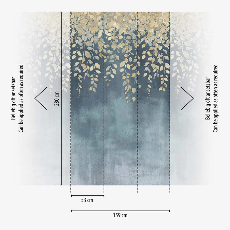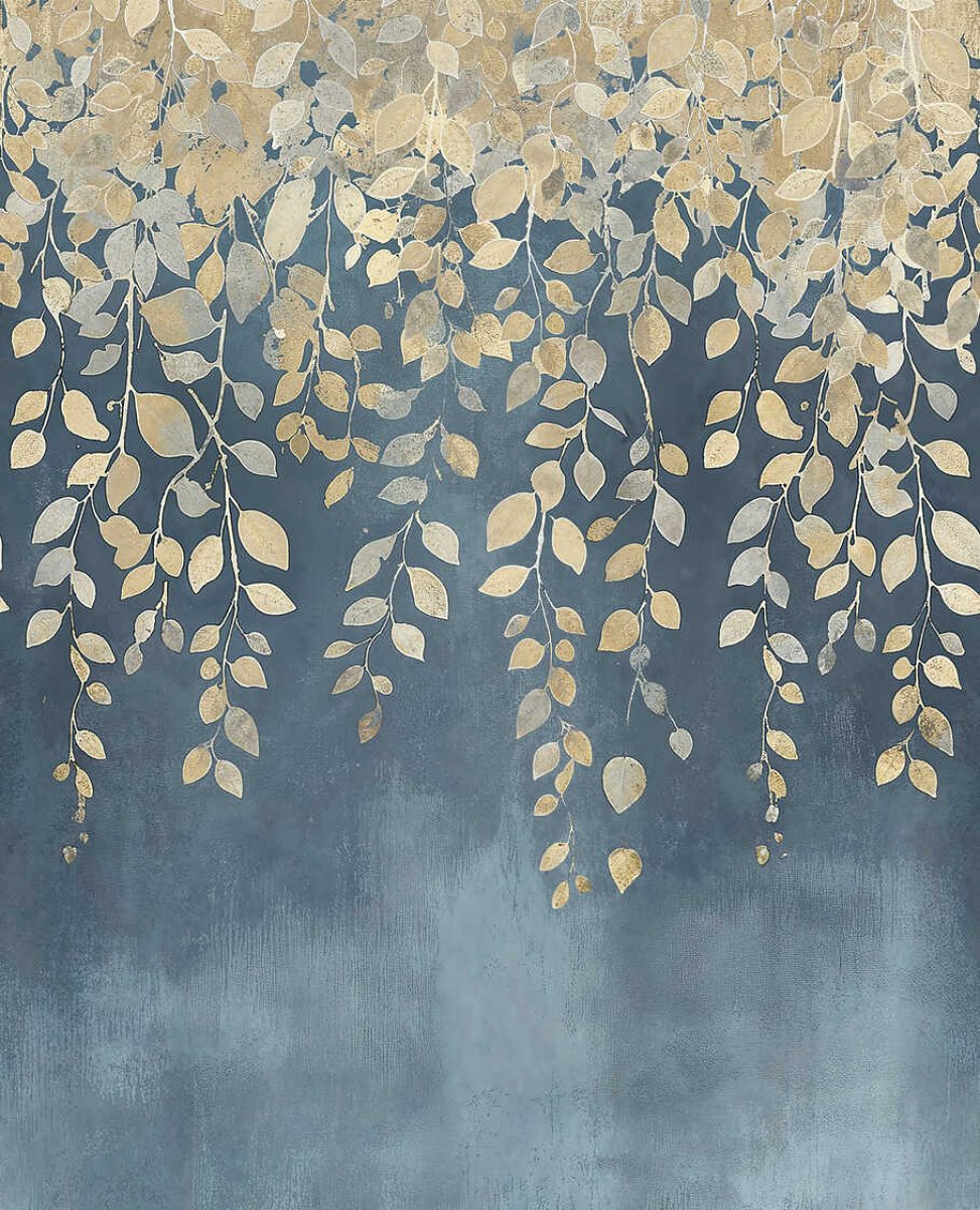 Филигранные золотые листья разных размеров и оттенков прокладывают свой путь сверху вниз по обоям. Листья словно свисают с веток и щетины, придавая мотиву естественную элегантность и легкость. Фон украшен мягким цветовым градиентом разных оттенков синего - от глубокого, почти бархатистого синего в центре до мягких, туманных оттенков светло-голубого и серого в нижней части. Слегка фактурная, живописная поверхность фона слегка напоминает акварель или краску для стен, придавая всему современный и в то же время художественный эффект. Сочетание матовых, холодных голубых тонов с мерцающими золотистыми акцентами создает изысканное, почти сказочное впечатление. Обои излучают чувство спокойствия и благополучия, а сусальное золото придает роскошный, но не чрезмерный оттенок. Этот мотив особенно подходит для помещений, где уют должен сочетаться с экстравагантностью.