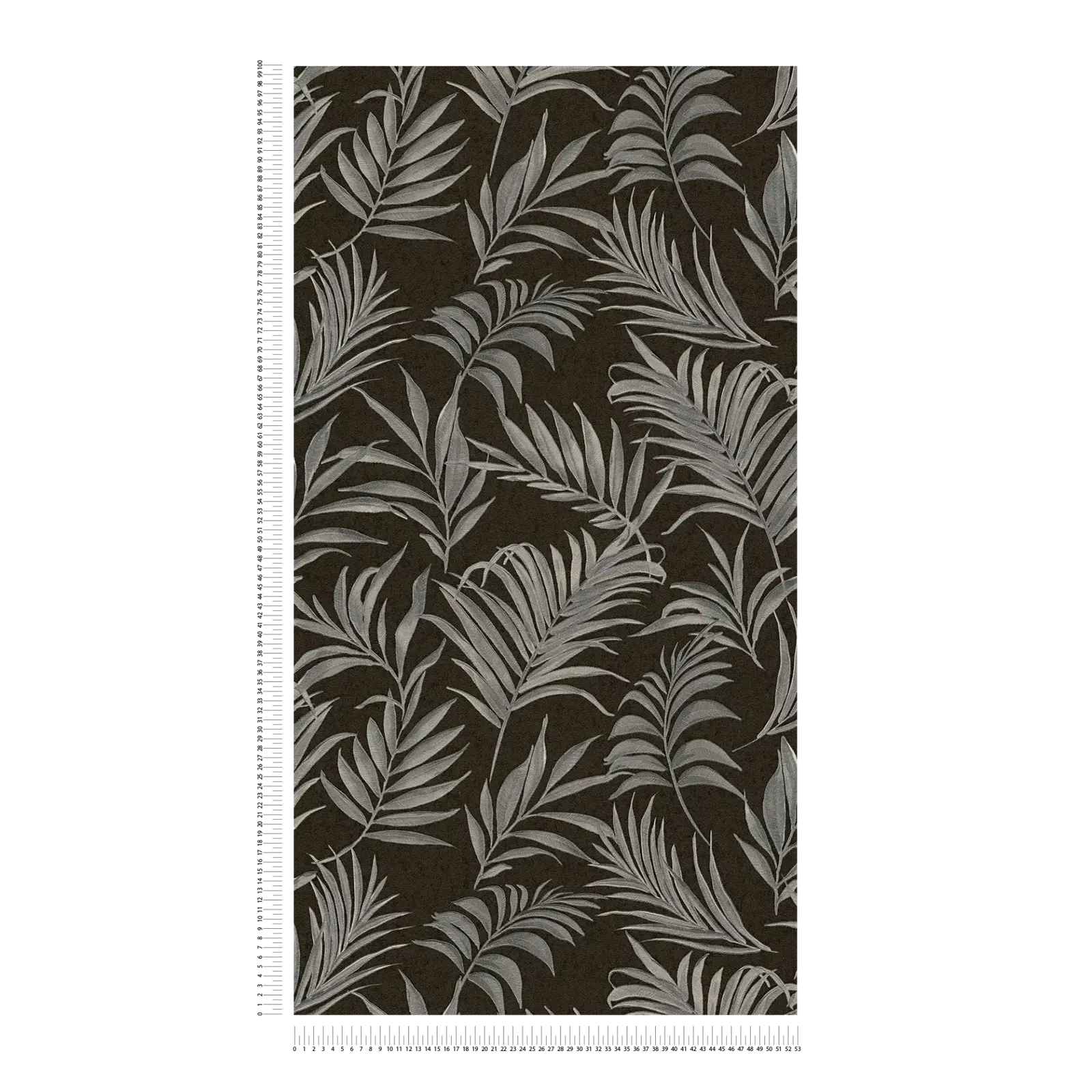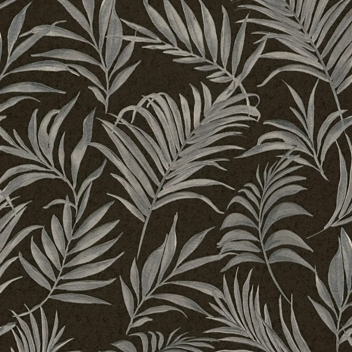 Мотив обоев изображает плотный узор из пальмовых листьев, разбросанных по поверхности в разных направлениях. Листья выполнены в тонких оттенках серого и серебристого, что придает им почти металлический вид с мелкими текстурными деталями, придающими мотиву глубину. Фон - насыщенный, теплый темно-коричневый или черный, который создает контраст с серебристыми структурами листьев. Общий эффект - тонкий и сдержанно роскошный. Рисунок напоминает современную интерпретацию мира тропических растений, но при этом остается стилизованным и сдержанным. Сочетание нейтральных, прохладных листьев и темного основного цвета создает спокойную, но элегантную и уютную атмосферу, которая прекрасно дополняет современные интерьеры.