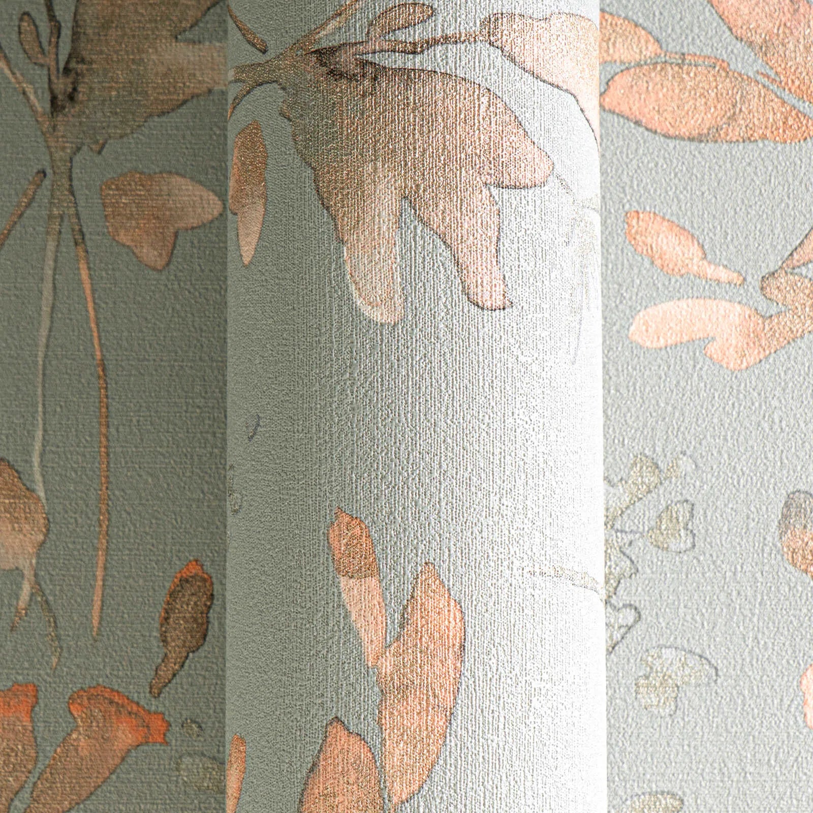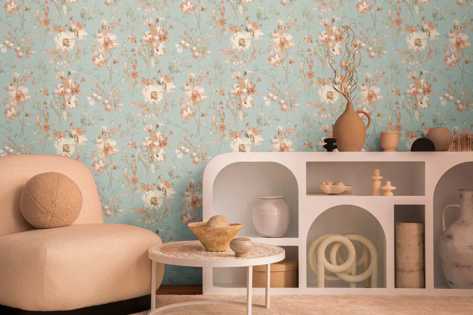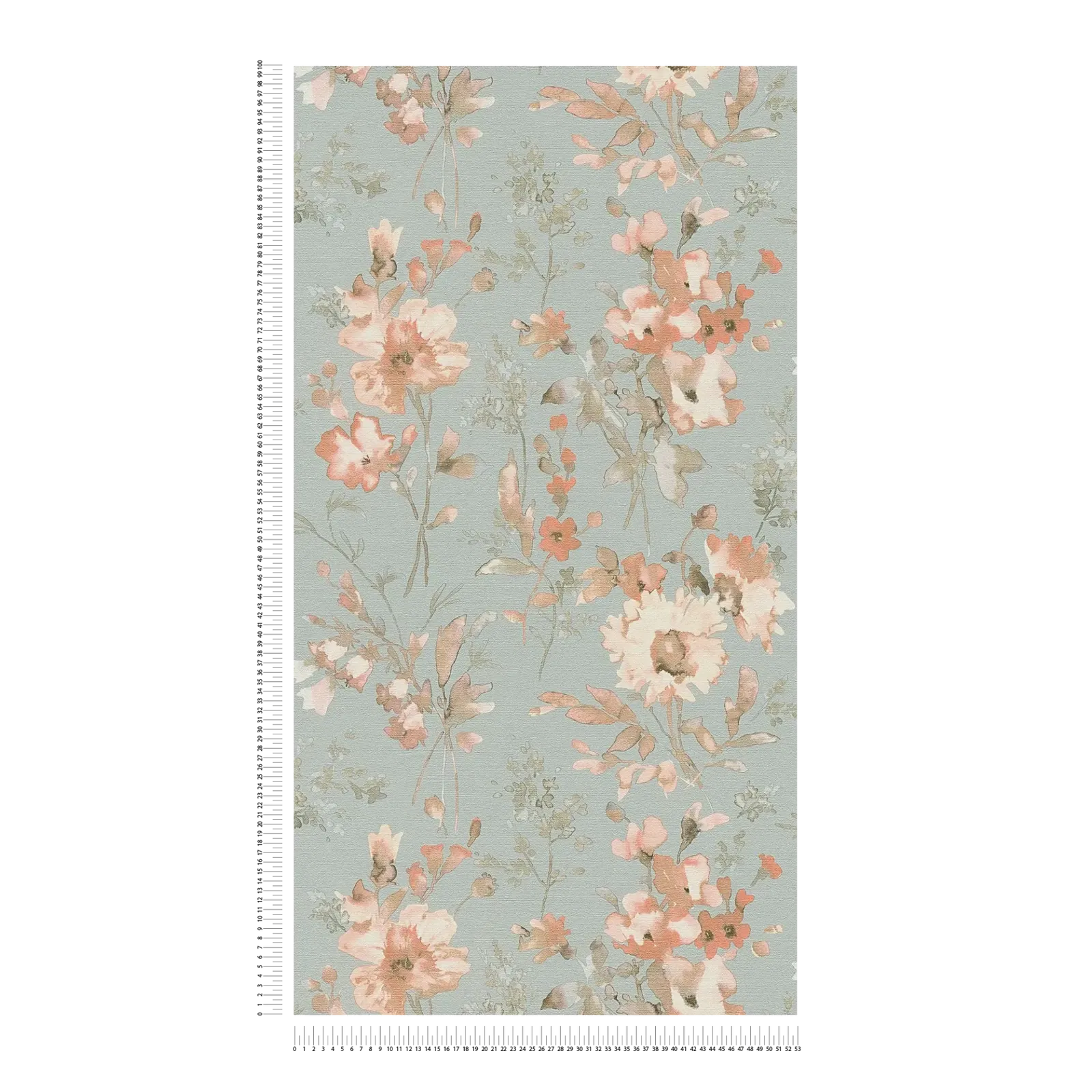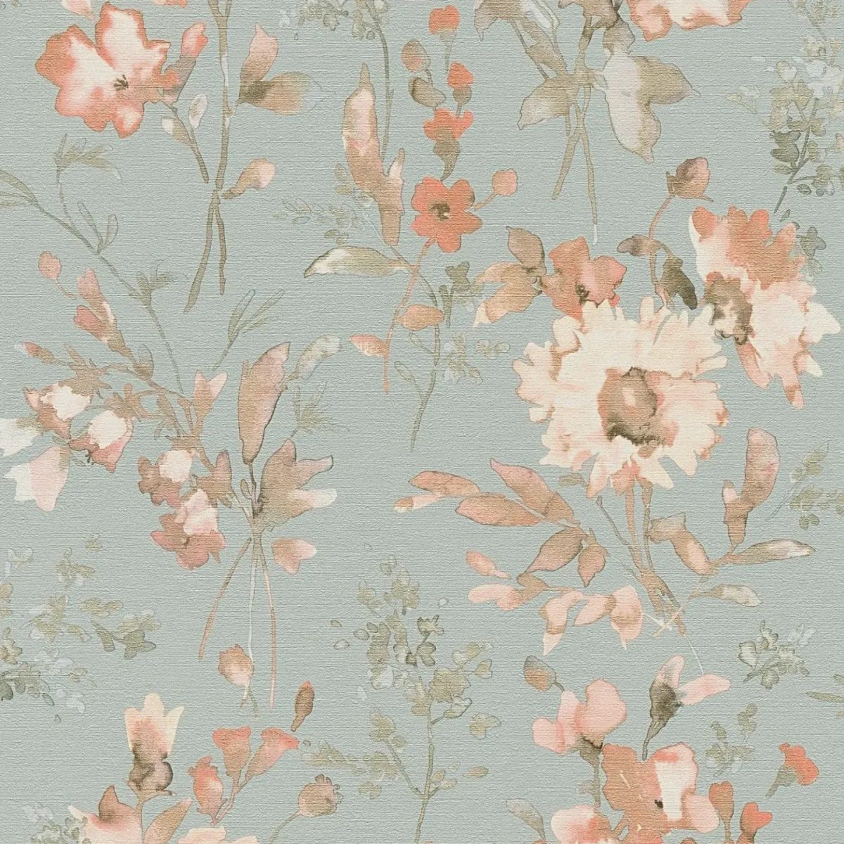 Akvareļveida ziedu motīvi izkliedēti brīvi un rotaļīgi uz maiga gaiši zila fona. Ziedi delikātos rozā un koraļļu toņos izskatās nedaudz caurspīdīgi, it kā tie būtu uzklāti ar smalku otu un nedaudz ūdens. Subtili, izbalējuši zaļie toņi uz lapām un stumbriem rada harmonisku, dabisku izskatu. Dizains ir brīvs, gandrīz skicveida, un rada viegluma un pavasara gaisotni. Kopējais efekts ir nomierinošs, draudzīgs un telpai piešķir relaksētu, romantisku atmosfēru.