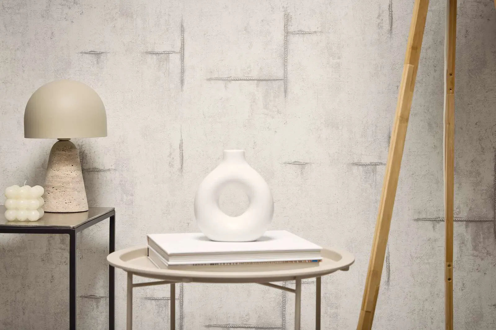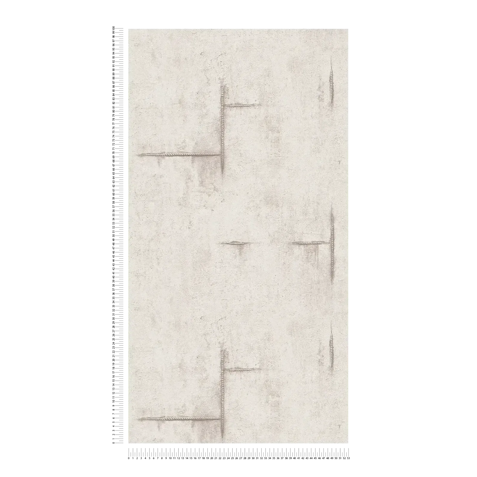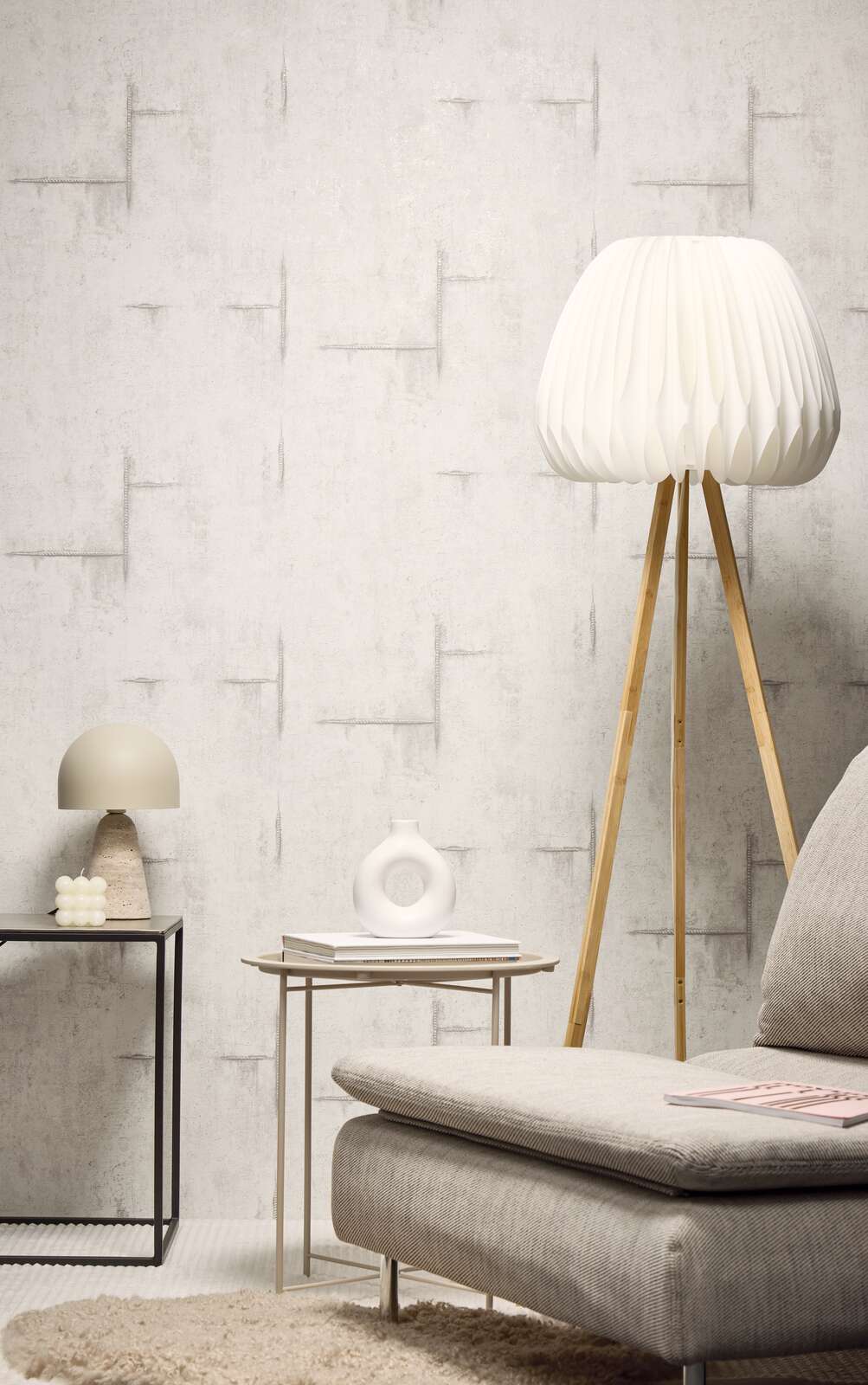 Tapetes motīvs ir minimālisma stilā, ar nedaudz raupju faktūru, gaišā, siltā pelēkā tonī ar nelielu smilškrāsas nokrāsu. Virsma izskatās kā smalks, laika apstākļu ietekmēts apmetums vai betons, piešķirot tai subtīlu industriālu šarmu. Virsma ir izrotāta ar neregulāri izkārtotām, skicētām līnijām un izteiksmīgām malām, kas atgādina grafiskus zīmējumus. Šīs līnijas ir tumšākā pelēkbrūnā krāsā un imitē nedaudz iegravētus vai izgrebtus rakstus, radot fascinējošu savstarpēju mijiedarbību starp atturību un izteiksmīgu akcentu. Neuzkrītošā krāsu gamma rada mājīgu, neuzbāzīgu atmosfēru un veido ideālu fonu modernam un urbānam interjeram. Subtila lietota izskata un ģeometrisko elementu kombinācija telpai piešķir arī izsmalcinātību un mūžīgumu.