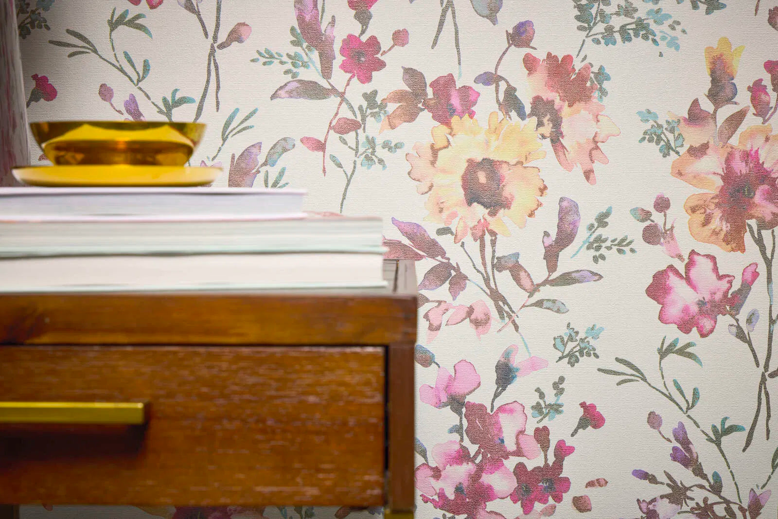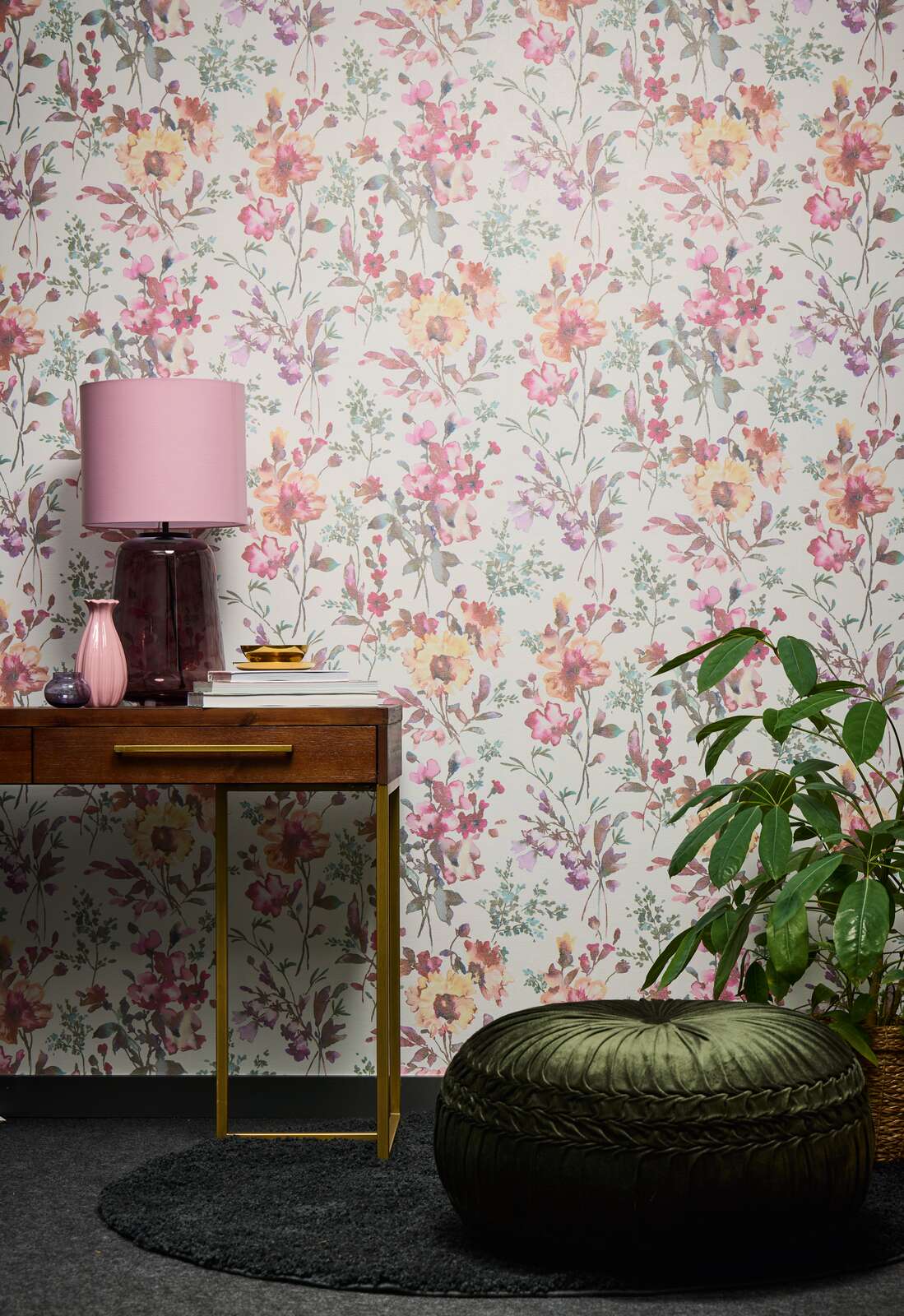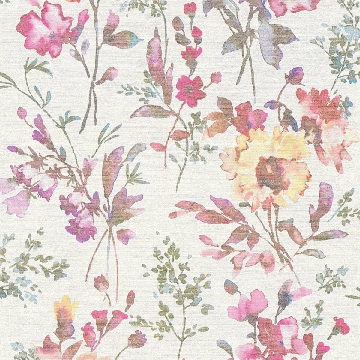 Delikāti akvareļu ziedi rozā, rožu un violeta toņos veido šo tapetu rakstu, kas mijas ar saules dzelteniem un pasteļoranžiem ziediem. Ziedu motīvi ir izkliedēti un nedaudz pārklājas uz gaiša, gandrīz balta fona, kas visam piešķir svaigu, gaisīgu izskatu. Smalki lapas un delikāti zari pelēkzaļā un gaiši zilā krāsā papildina ziedu kompozīciju un piešķir tai dziļumu un vieglumu. Tapetes motīvs ir moderns, taču romantisks un sievišķīgs, iedvesmojoties no mūsdienu akvareļu glezniecības. Harmoniska, maiga krāsu gamma rada draudzīgu, dzīvīgu efektu un telpā ievada rotaļīgu, pavasara atmosfēru.