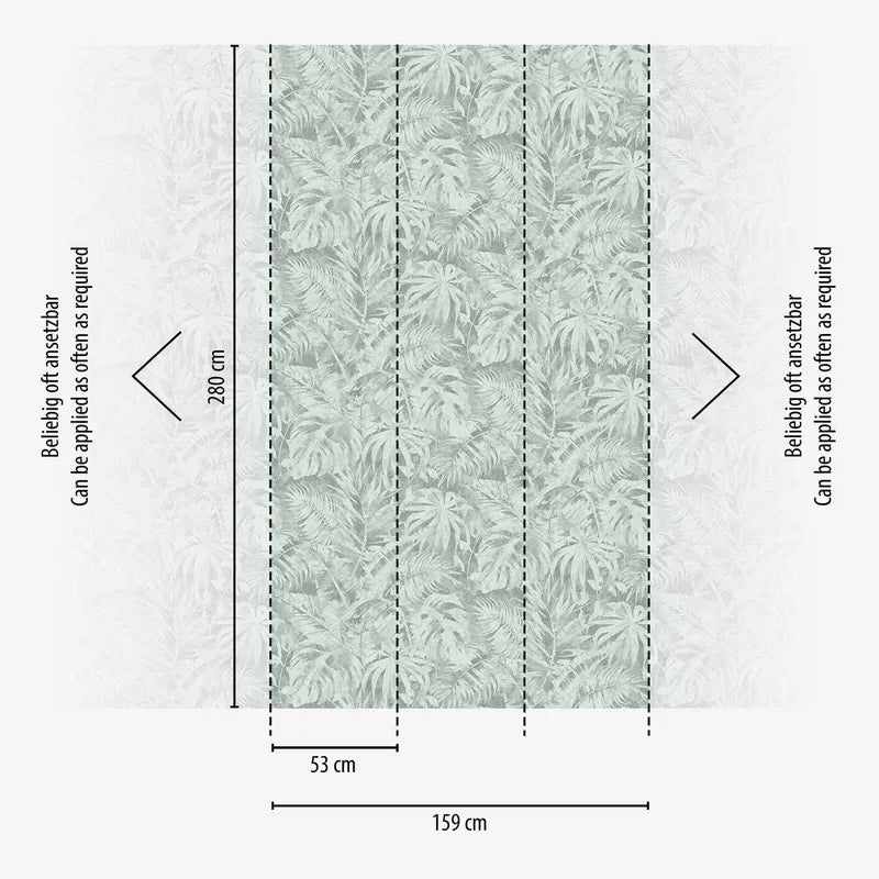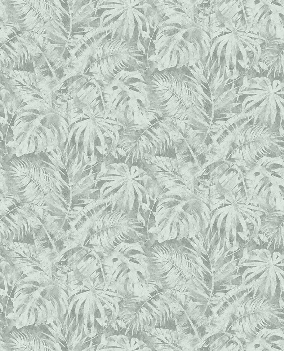 На этих обоях изображены густые листья различных тропических растений, включая монстеру и пальмовые листья, которые гармонично повторяются по всей поверхности. Листья стилизованы и выглядят так, будто их нарисовали тонкой кистью, а контуры и заливка сливаются в единое целое. Цветовая палитра состоит из различных оттенков прохладной, спокойной мятной зелени и серых тонов, что придает общему образу очень спокойную и расслабленную атмосферу. Ограниченная цветовая палитра создает мягкий, элегантный образ, сочетающий в себе экзотический шарм и современную сдержанность, поэтому гармонично и ненавязчиво вписывается во многие концепции помещений. Слегка текстурированный эффект мазков придает обоям живость и глубину.