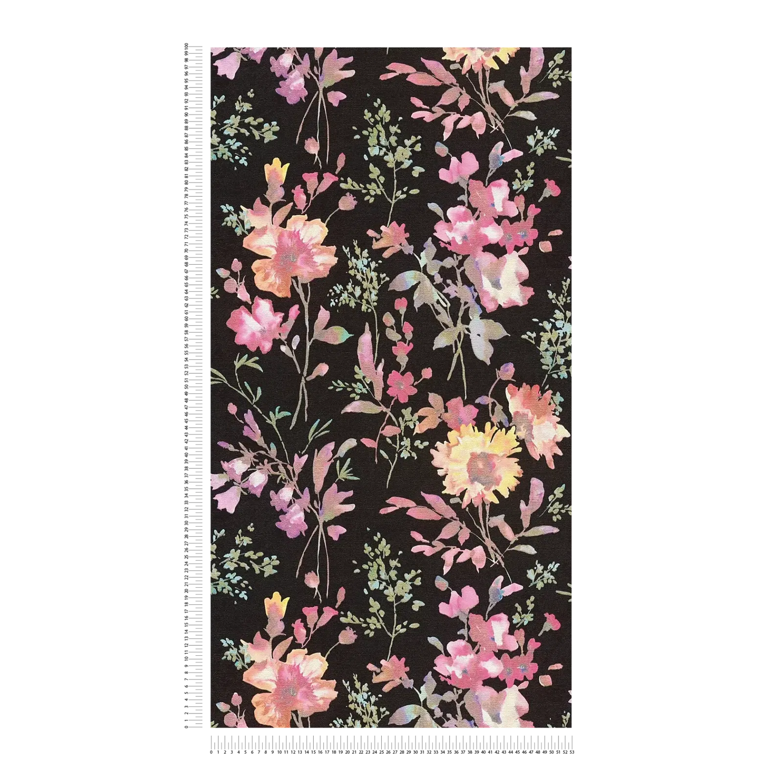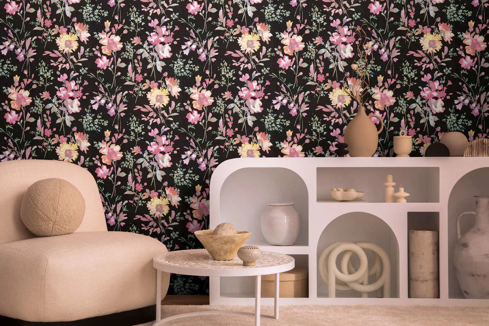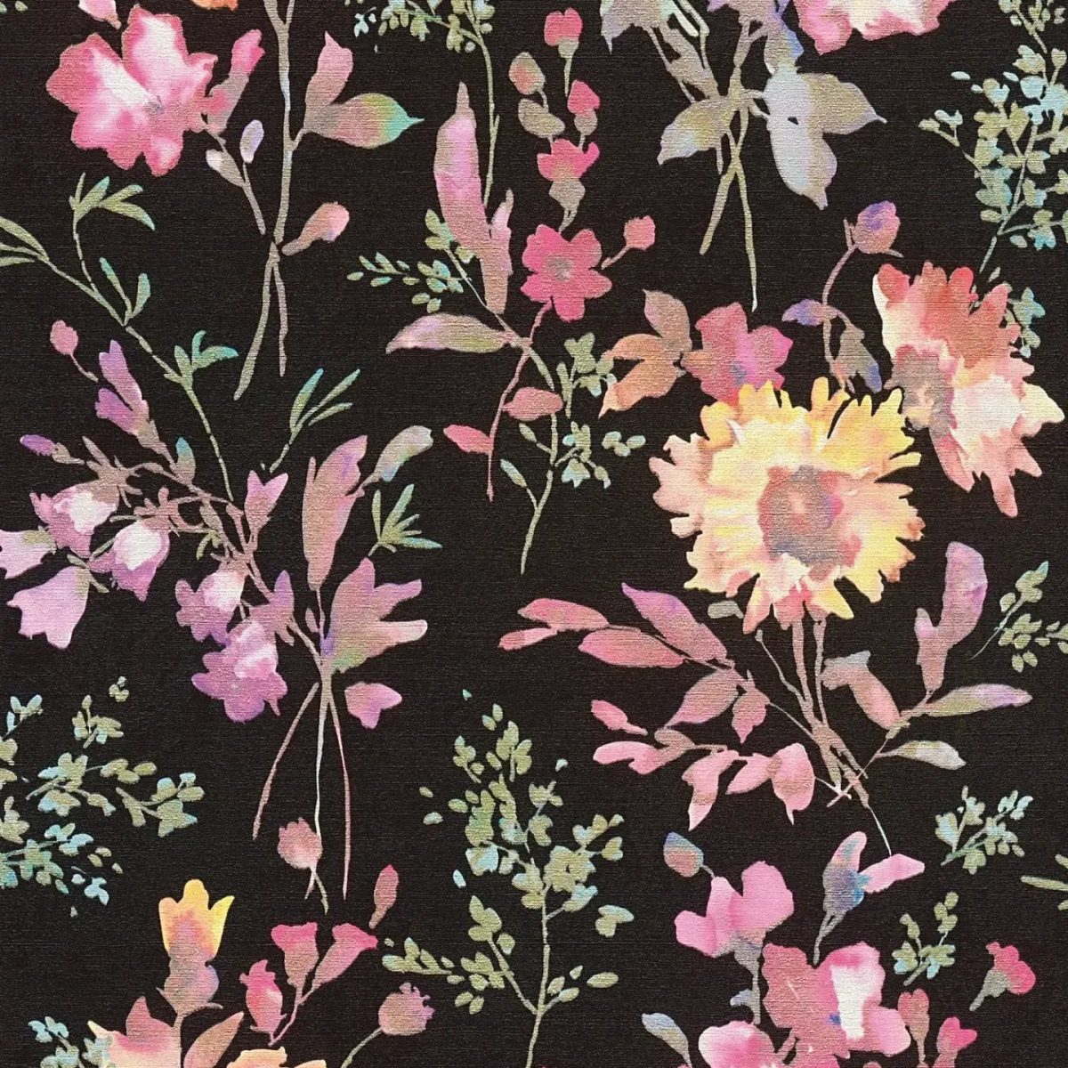 Delikāti, pasteļtoņos ziedi un lapas izkliedēti uz tumši melna fona. Ziedu raksts izskatās kā gleznojums ar brīviem otu triepieniem akvareļa stilā: ziedi mirdz dažādos rozā toņos, no maiga aprikožu krāsas līdz spilgtai rozā un lavandas nokrāsai. Starp tām mirdz gaiši dzeltenas un persiku krāsas akcenti, bet atsevišķas lapas ir izrotātas ar vēsām zaļām un zilām nokrāsām. Kontrasts starp tumšo fonu un jautrajām, gandrīz spilgtām krāsām rada elegantu, modernu un romantisku noskaņu. Kompozīcija liek ziediem izskatīties gandrīz bezsvara, it kā tie peldētu virs virsmas, piešķirot telpai rotaļīgu, bet stilīgu atmosfēru.