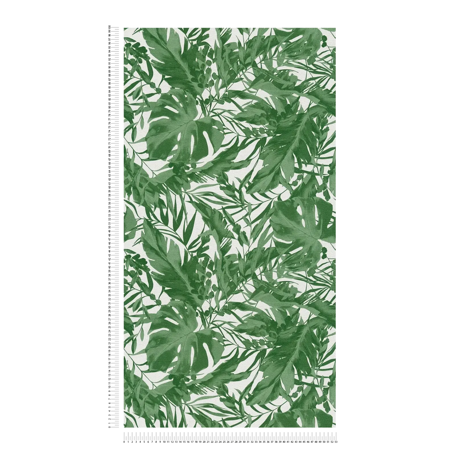 Lielas, sulīgas tropisko augu lapas dominē rakstā un pārklājas ar dažādiem zaļas krāsas toņiem. Lapu formas atgādina monstera, papardes un citus eksotiskos augus, kas ir bagātīgi detalizēti, bet zīmēti brīvā, akvareļveida stilā. Zaļie toņi mainās no bagātīgas lapu zaļas krāsas līdz delikātiem, caurspīdīgiem toņiem, radot vieglu, svaigu atmosfēru. Baltā fona dēļ zaļā krāsa izskatās īpaši dzīvīga un uzsver motīva dabisko raksturu. Dizains rada blīvas tropu džungļu sajūtu un, pateicoties dabisko formu un krāsu kombinācijai, telpā ievieš relaksējošu, atspirdzinošu efektu.