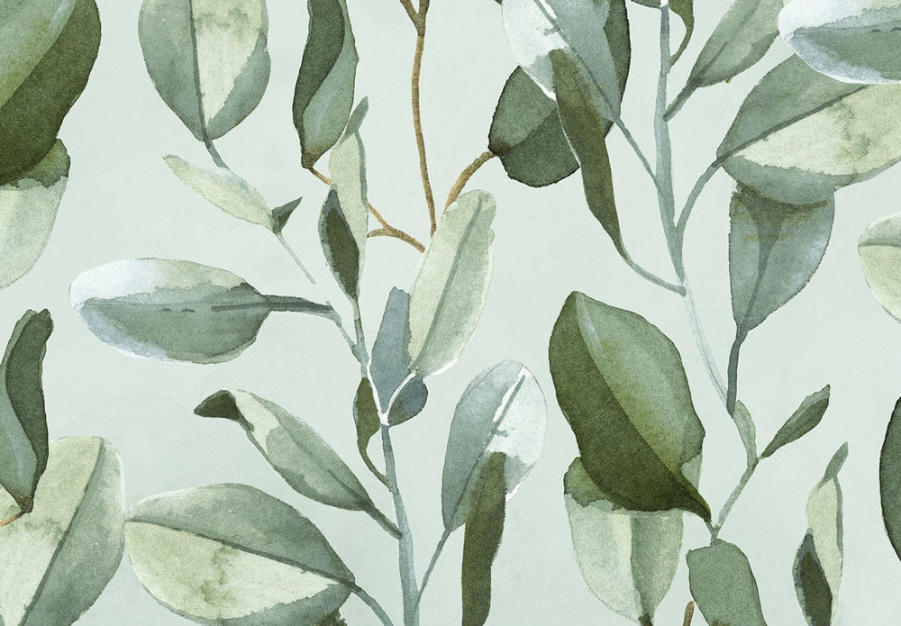 Фотообои - Зеленые листья на белом фоне - акварельная техника, 135388