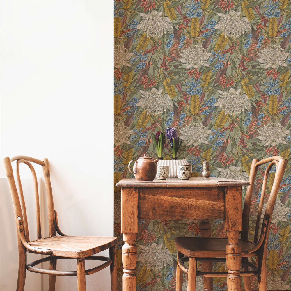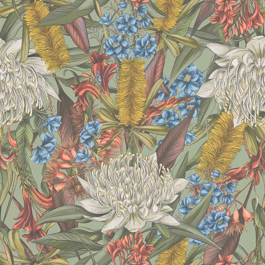 Цветочные обои с листьями и цветами джунглей, 1402051