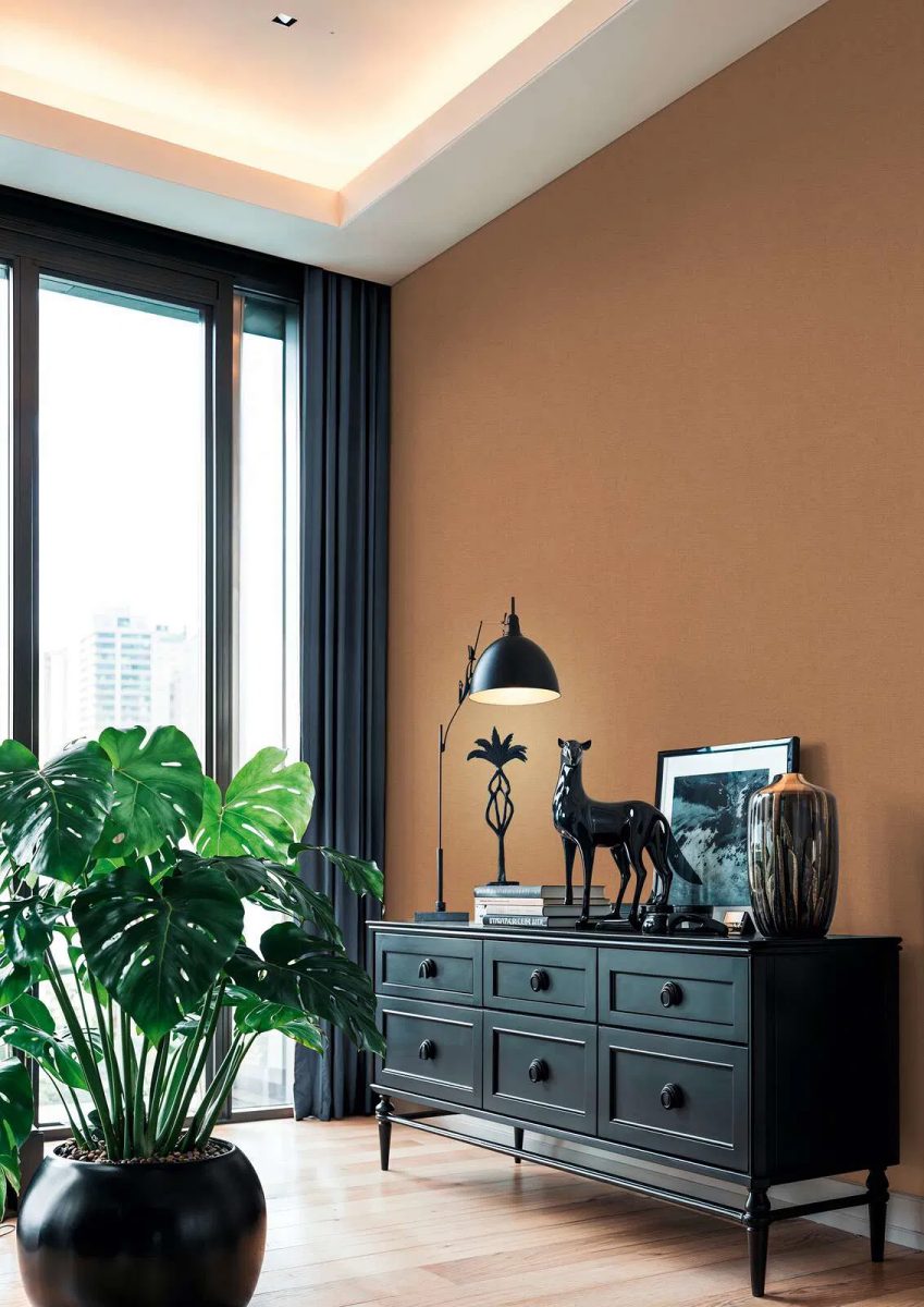 Прочные и легко ухаживаемые обои с матовой поверхностью. Они не выцветают на солнце и устойчивы к царапинам. Укладка облегчается тем, что не нужно искать совпадение узора между листами. Визуально обои напоминают натуральную льняную ткань. Коричневый тон насыщенный и элегантный, придавая стенам глубину и приятное, текстурированное ощущение. Этот дизайн прекрасно дополняет натуральные элементы интерьера и деревянную мебель.